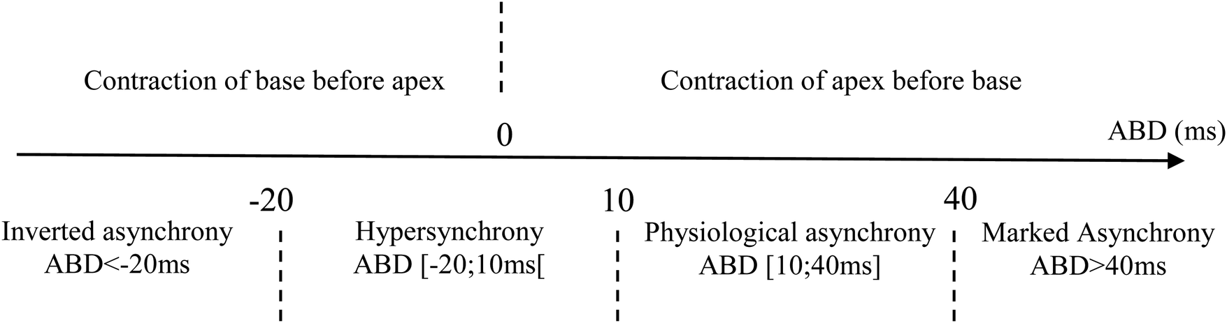 The XLstat software (Addinsoft, Paris, France) was used to quantify the phase delay associated with the apex-base delay (ABD). This delay is characterized as the temporal discrepancy in milliseconds between the apical and basal points. A positive value denotes that the apex contracts before the base, while a negative value signifies that the base's contraction precedes that of the apex.