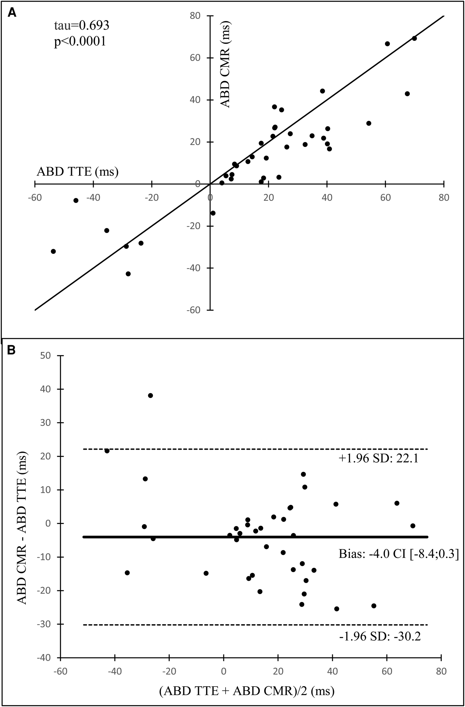 To assess intra- and inter-observer variability for ABD determined with TTE and CMR, cases (both controls and HCM patients) were reanalyzed off-line by the original observer and by a second observer, who was blinded to the initial results. We evaluated intra-observer variability and inter-observer variability in the determination of ABD, using both TTE and CMR imaging techniques.