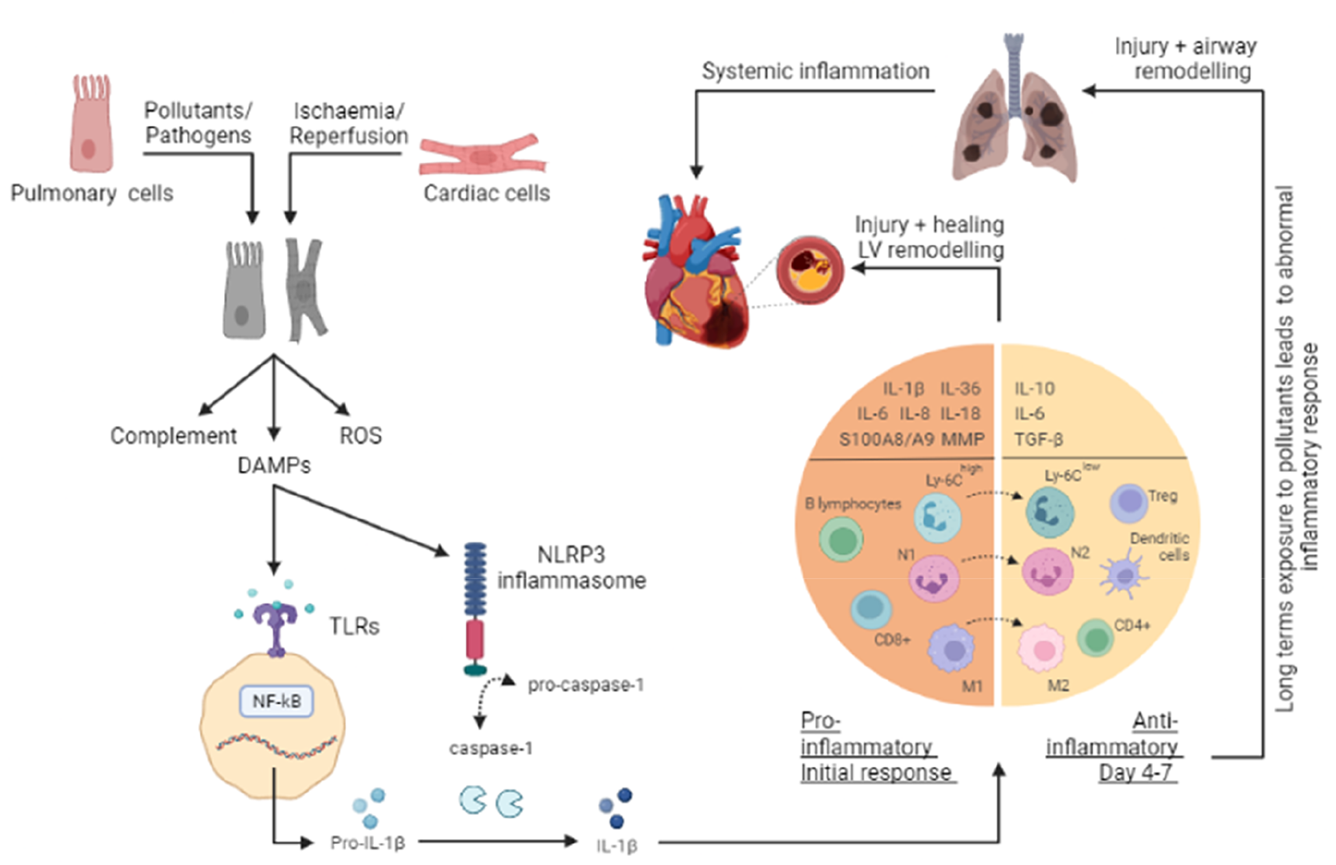 Overview of the inflammatory response in a COPD and AMI. The onset of either acute myocardial infarction (AMI) or chronic obstructive pulmonary disease (COPD) leads to cellular injury and necrosis of cardiac cells and pulmonary cells respectively, resulting in the release of intracellular content such as damage-associated molecular patterns (DAMPs), production of reactive oxygen species (ROS) and activation of the complement cascade. Once a DAMP (such as DNA, mitochondrial DNA (mtDNA), RNA, and the nuclear factor - high mobility group box 1 (HMGB1), and ATP) is recognised by toll-like receptors (TLRs), cytoplasmic myeloid differentiation factor 88 (MyD88) is activated. This in turn, stimulates the NF–κB pathway and through a signaling cascade and transcription, leads to the release of several inflammatory mediators such as pro-interleukin (IL)-1β. Additionally, in response to the release of DAMPs, inflammasomes (such as nucleotide-binding oligomerization domain receptor family protein 3, NLRP3) are activated to promote the cleavage of pro-Caspase-1 into Caspase-1, which in turn processes the pro-IL-1β into the active IL-1β form. As a result, pro-inflammatory mediators (IL-1β, IL-1α, IL-6, IL-8, IL-18, IL-36, S100A8/A9, and MMPs) and cell adhesion molecules are increased at the site of injury. Extravasation and recruitment of neutrophils and other leucocytes (monocytes, macrophages, B lymphocytes, and CD8+ T cells) to the site then occurs as a result of the interactions between endothelial cells and infiltrating leucocytes. The subsequent anti-inflammatory phase (day 4-7) facilitates the resolution and repair through anti-inflammatory cytokines (IL-10, IL-6, and TGF-β), changes in macrophages (M1 to M2) and monocytes (Ly6Chigh to Ly6Clow), and recruitment of cells (T-regs, dendritic cells, CD4+ T cells). This response serves to help wound healing; however, a prolonged and excessive inflammatory response can worsen these conditions, leading to further injury and remodeling. Additionally, long term exposure to pollutants can enhance and alter the inflammatory response in the lungs, resulting in a progressive and persistent inflammatory response.