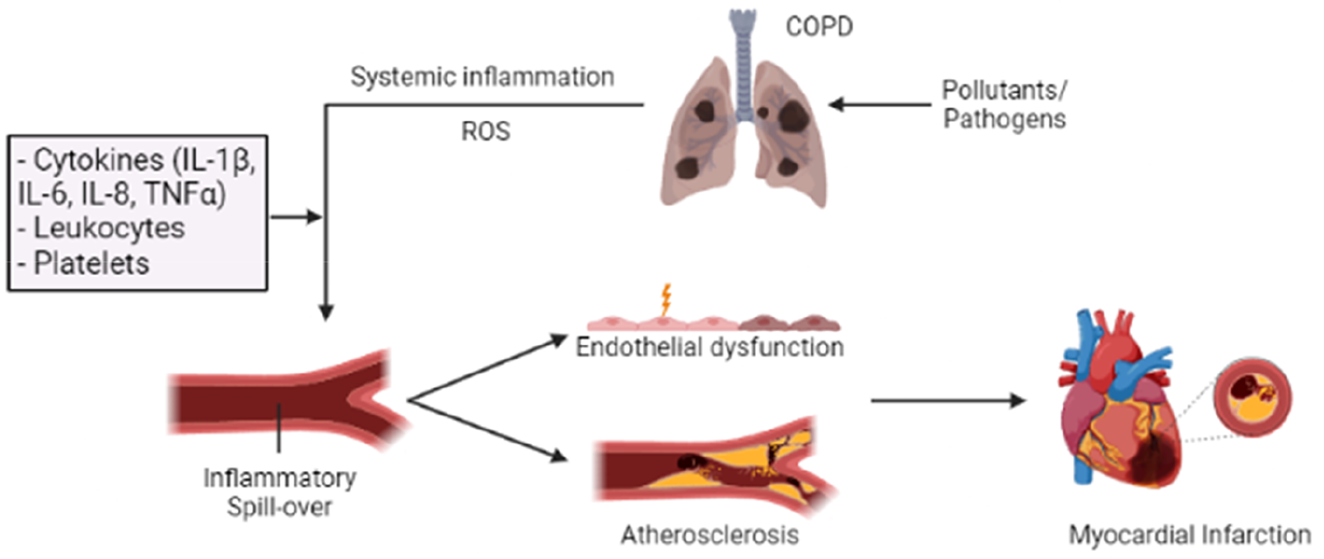 Overview of how inflammation in COPD can “spill over” into the systemic circulation, increasing the risk of AMI. Long-term exposure to pollutants and frequent acute exacerbations of chronic obstructive pulmonary disease (AE-COPD) can enhance and alter the inflammatory response in the lungs, resulting in a progressive and persistent inflammatory response. This COPD-related inflammatory response can promote systemic inflammation and oxidative stress through several inflammatory mediators (IL-1β, IL-6, IL-8, and TNF-α). Their actions can induce endothelial injury and vascular dysfunction through increased endothelial permeability and enhanced oxidative stress. Additionally, prolonged inflammation and oxidative stress can contribute to the development of atherosclerotic plaque and thrombosis, thereby increasing the risk of acute myocardial infarction (AMI). Patients with COPD exhibit a heightened platelet count and reactivity, ultimately increasing the risk of thrombotic events.