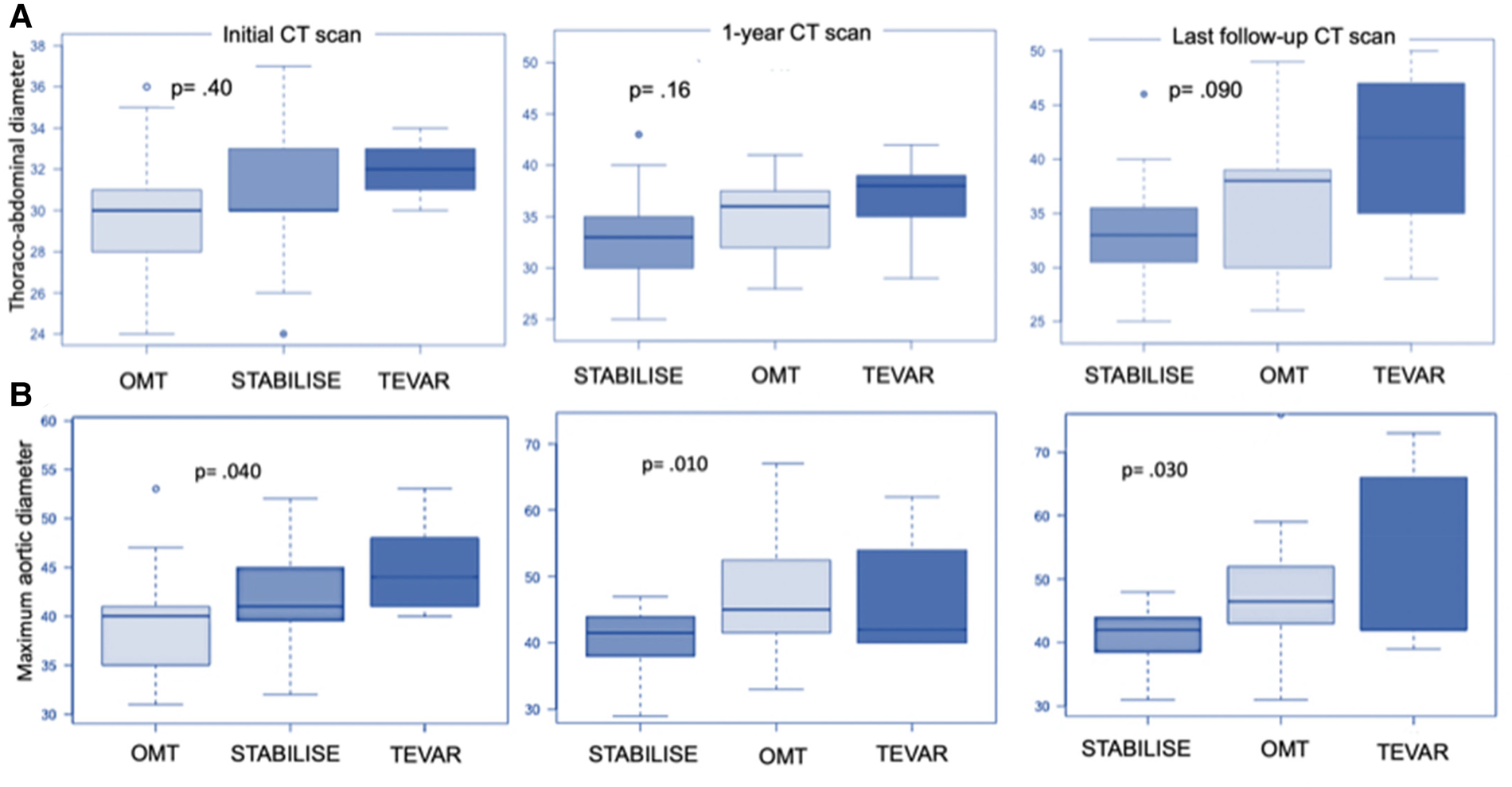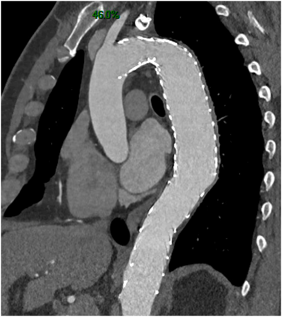 Scan image analysis and measurements were performed using three-dimensional imaging software (Osiris software, Geneva, Switzerland). Diameter measurements were performed on the perpendicular axis according to the centerline using a semiautomated centerline algorithm on the initial CT scan and at the 6-month, 12-month, and last follow-up CT scan available at different levels: at the level of the descending thoracic aorta, the TA aorta, and the abdominal aorta. The maximum aortic diameter of the thoracic aorta was measured for each patient.
