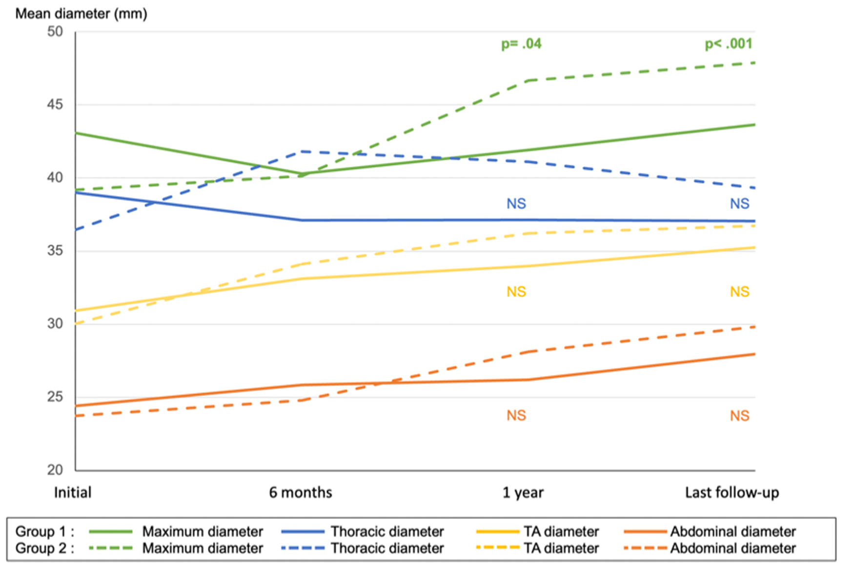The patients in group 1 had a significantly larger maximum aortic diameter than that in patients in group 2: 43.08 mm vs. 39.19 mm, respectively (p = .040). The mean follow-up time was 38.08 months: 41.54 months in group 1 vs. 34.88 months in group 2 (p = .34).
