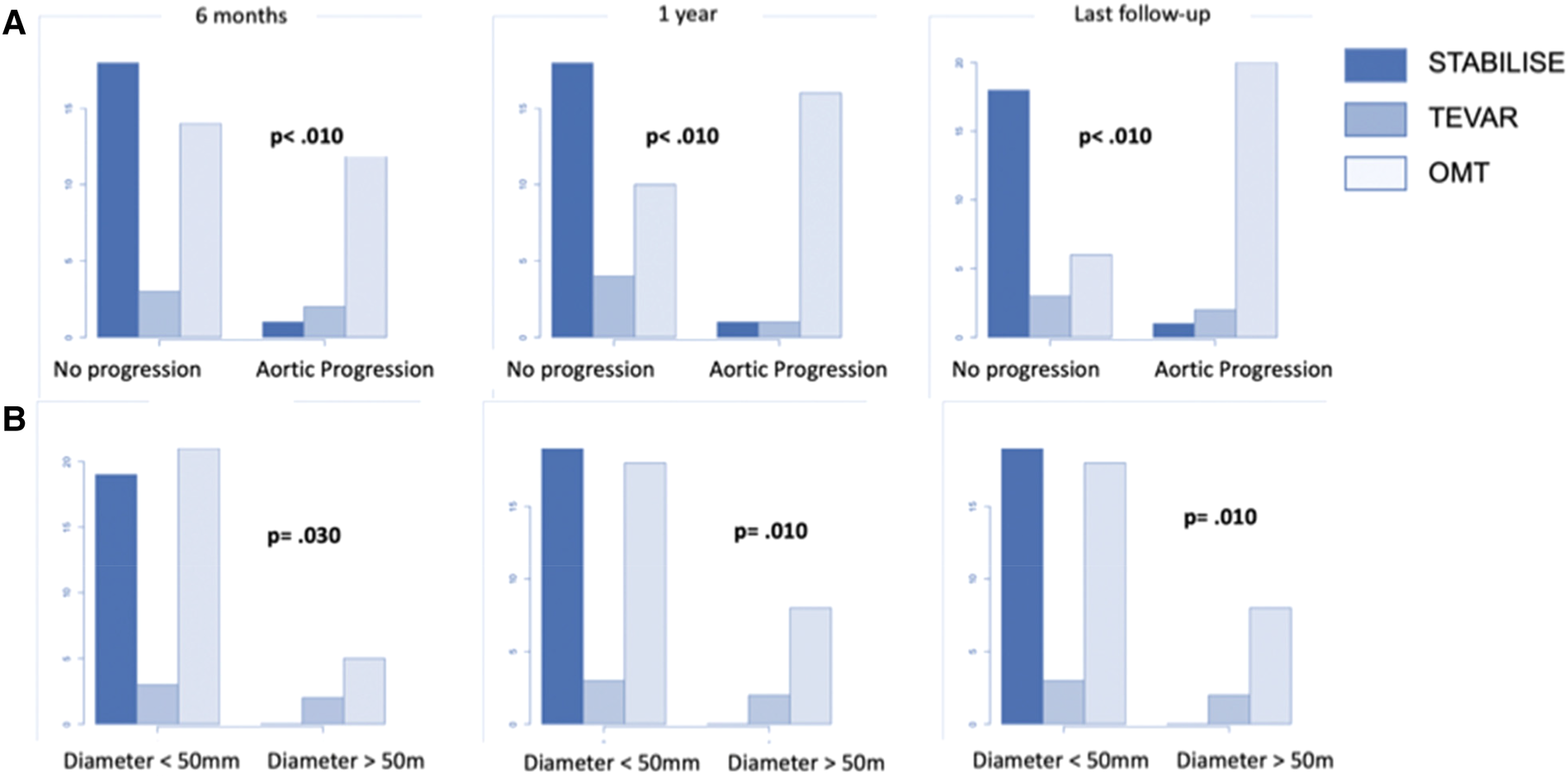 Between 2011 and 2021, preemptive endovascular procedures at the acute and early subacute phase (<30 days) were performed on 24 patients (group 1) and OMT alone on 26 patients (group 2). With a mean follow-up of 38.08 ± 24.53 months, aortic events occurred in 20.83% of patients from group 1 and 61.54% of patients from group 2 (p < .001). No patient presented aortic-related death during follow-up. There were no differences in postoperative events (p = 1.00) and non-aortic events (p = 1.00). OMT patients had significantly more aneurysmal progression of the thoracic aorta (p < .001) and maximal aortic diameter (p < .001). Aortic remodeling was found in 91.67% of patients in group 1 and 42.31% of patients in group 2 (p < .001). A subgroup analysis of patients in group 1 showed that patients treated with preemptive TEVAR and STABILISE had reduced maximum aortic diameters at the 1-year (p = .010) and last follow-up (p = .030) compared to those in patients treated with preemptive TEVAR alone.