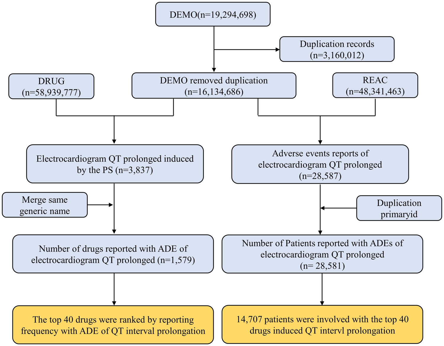 SAS (9.4) was applied in our study for data mining. We chose PRIMARYID, CASEID, and FDA_DT in the DEMO table and sorted them in the order of CASEID, FDA_DT, and PRIMARYID in accordance with the FDA's method for removing duplicate reports. We maintained the maximum value of FDA_DT for reports that had the same CASEID. Then, we reserved the report with the highest value of PRIMARYID for reports with the same CASEID and FDA_DT. The primary suspect drug (PS) was found by applying the preferred term (PT) “Electrocardiogram QT Prolonged” with the PT code 10014387 from the Medical Dictionary for Regulatory Activities (MedDRA) 26.0.