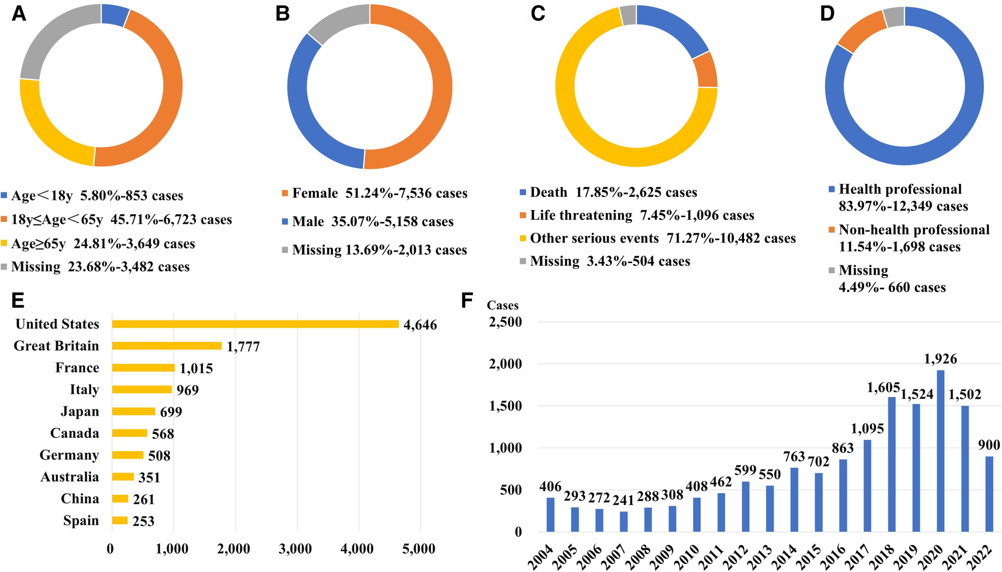 Figure 2. Patients’ characteristics and reporting information for the top 40 drugs with ADE of QT interval prolongation. (A) Distribution of patients’ age (B) Distribution of patients’ gender. (C) Distribution of patients’ outcome (D) Distribution of the reporters (E) Top 10 countries with the most sources of reports. (F) Distribution of the reporting year.