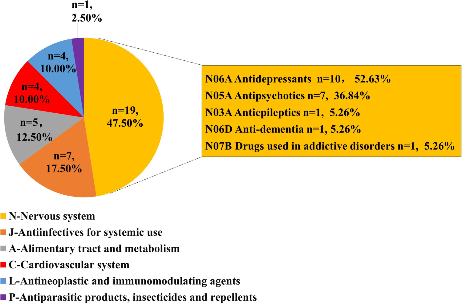 The top 40 drugs (Table 1) by overall frequency of presence, with cases reported ranging from 155 to 1,151 and RORs ranging from 1.19 to 312.67, were taken into further analysis. The top 3 drugs with the highest number of reported cases were quetiapine (1,151 cases), olanzapine (754 cases), and citalopram (720 cases), and the 3 drugs with the highest ROR values were cisapride (ROR = 312.67, 95% CI: 281.35–347.47), bedaquiline (ROR = 125.94, 95% CI: 109.23–145.21), and dofetilide (ROR = 37.53, 95% CI: 33.79–41.70). According to the first level of the ATC classification, we divided the 40 drugs into categories. As shown in Figure 3, the most common drugs causing QT interval prolongation in the FAERS database were the drugs for the nervous system (ATC N, n = 19, 47.50%) and antiinfectives for systemic use (ATC J, n = 7, 17.50%). When we further classified the drugs for the nervous system at the third level of the ATC classification, we discovered that antidepressants (ATC N06A, n = 9, 47.37%) and antipsychotics (ATC N05A, n = 7, 36.84%) were the two primary drug classes.