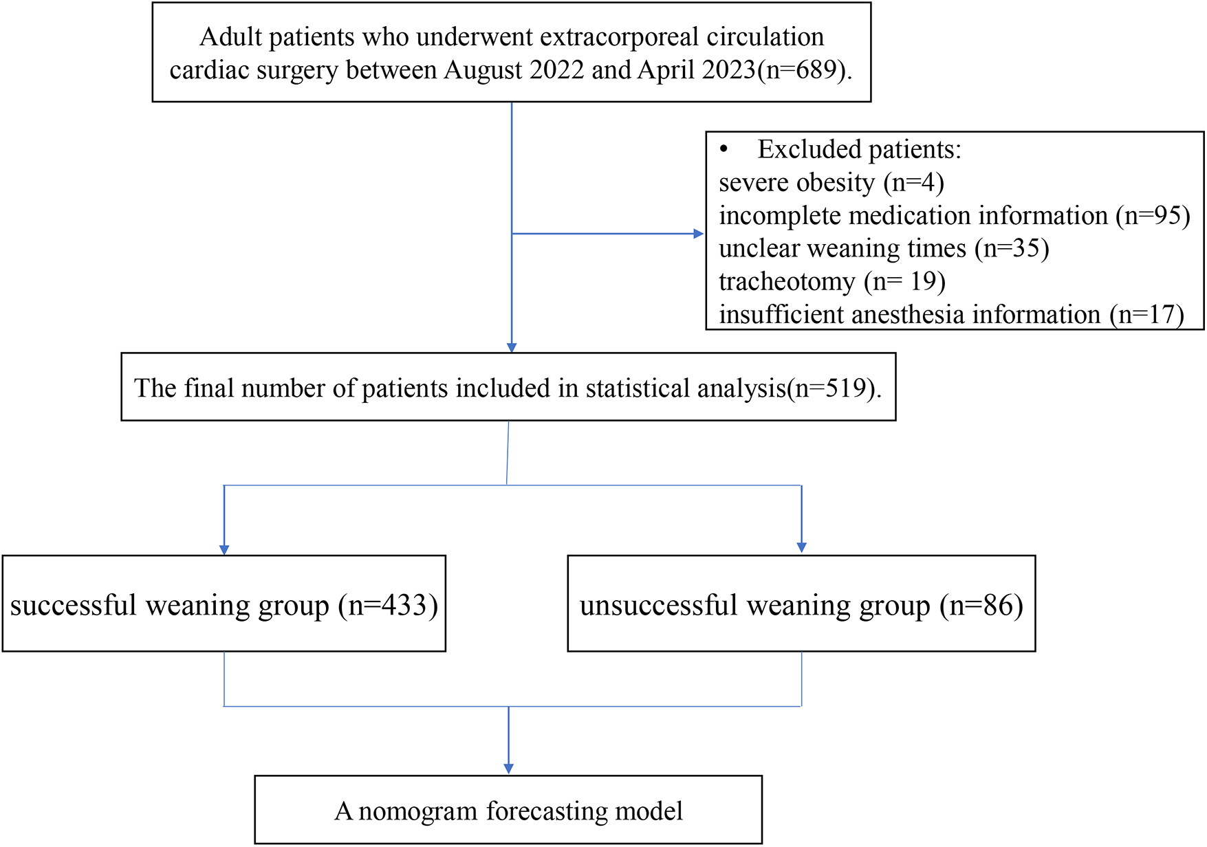 During the research period (August 2022–April 2023), 689 adult patients undergoing cardiac surgery were evaluated for eligibility. Of these, 170 patients were excluded because of severe obesity (4 patients), incomplete medication information (95 patients), unclear weaning times (35 patients), tracheotomy need (19 patients), or insufficient anesthesia information (17 patients). Ultimately, 519 patients were included in this study (Figure 1), with weaning failure events occurring in 86 (16.6%). Of these, 64 (12.3%) failed the SBT, 13 (2.5%) shifted to non-invasive ventilation within 48 h post-weaning, and 9 (1.7%) required re-intubation within 48 h post-surgery. The general baseline characteristics of the patients are shown in Table 1.