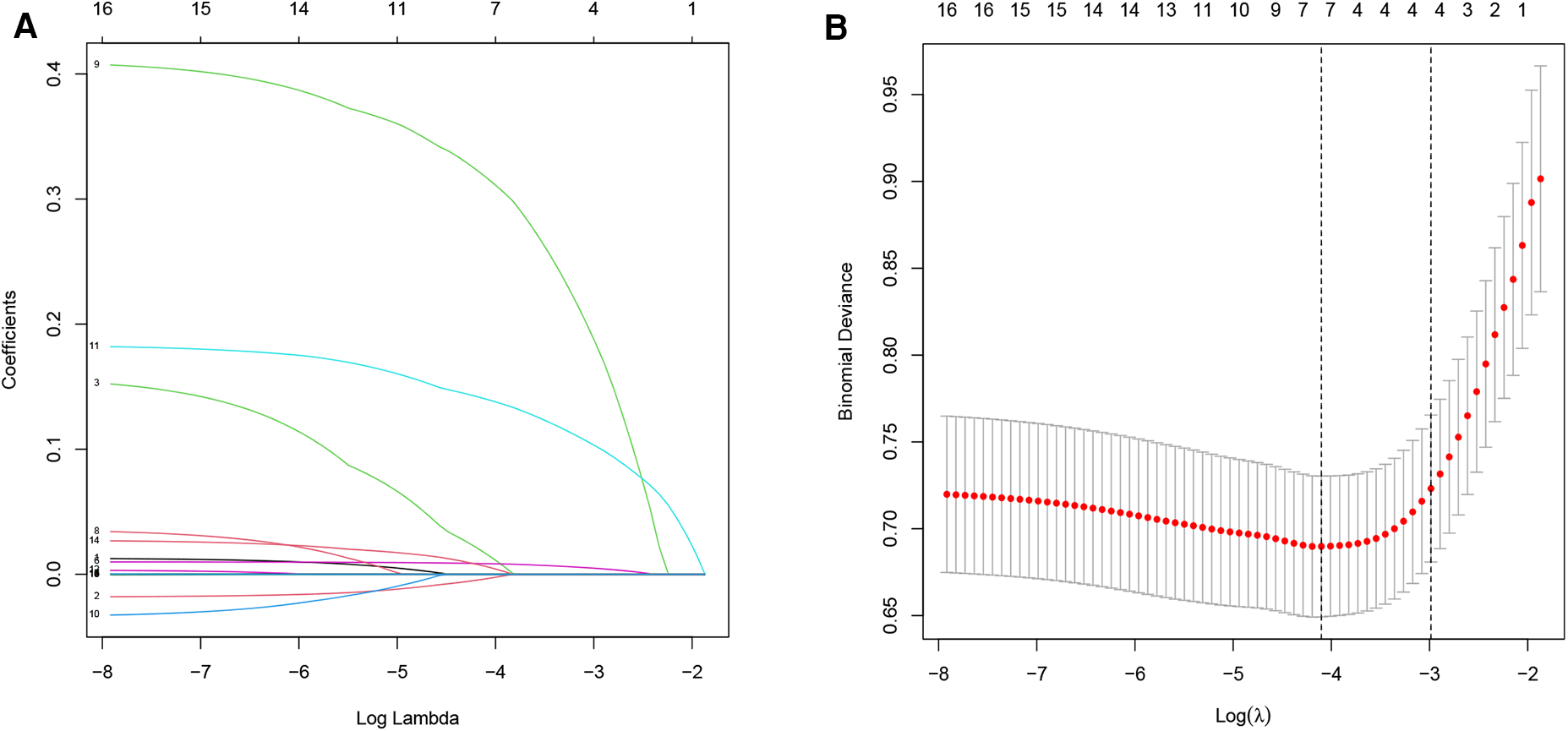 Univariate logistic regression was used to evaluate the predictive variables, with further selection of significant variables using the Least absolute shrinkage and selection operator (LASSO) regularization method (17). Subsequently, factors with nonzero coefficients in the LASSO regression were used by performing bidirectional selection of multivariable logistic regression to develop the prediction model and nomogram.
