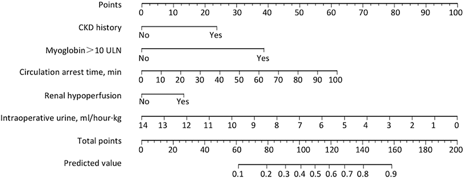 Postoperative acute kidney injury (PO-AKI) was assessed according to the Kidney Disease: Improving Global Outcomes (KDIGO) guidelines within postoperative 1 week, as any of the following: an increase in serum creatinine (SCr) by ≥0.3 mg/dl (≥26.5 μmol/L) within 48 h; an increase in SCr to ≥1.5-fold of the baseline value, which is known or presumed to have occurred within the prior 7 days; or urine volume <0.5 ml/kg/h for 6 h. Therein, patients were first grouped into the AKI group and the no-AKI group. Baseline renal function was defined as preoperative eGFR. The myoglobin limit of 700 ng/ml is approximately 10 times greater than the upper limit of normal (ULN) values for our clinical laboratory, a value that would eliminate from consideration a large number of patients with mild myoglobin level elevations and still provide a broad range of values to evaluate. Therefore, we defined the variable “myoglobin > 10 ULN” as serum myoglobin greater than 10 times the ULN (>700 ng/ml), tested immediately after the procedures.