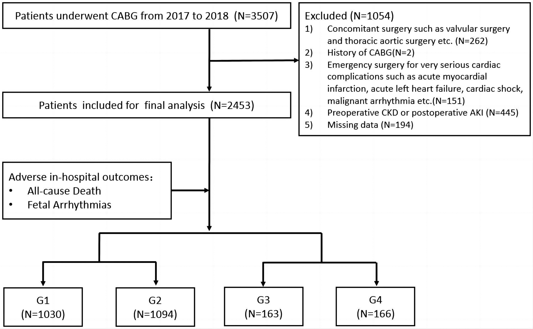 We retrospectively reviewed 3,507 patients undergoing CABG in the Department of Cardiac Surgery at Beijing Anzhen Hospital between 1 January 2017 and 31 December 2018. Patients who underwent concomitant surgery including valvular surgery (for severe tricuspid/mitral stenosis or regurgitation) and thoracic aortic surgery (for aortic dissection) (n = 262), patients who underwent emergency surgery for unstable hemodynamics such as an extremely poor cardiac function (n = 151), patients with a CABG history (n = 2), patients with missing data (n = 194), and patients with preoperative chronic kidney disease (CKD) and postoperative AKI (n = 445) were excluded.