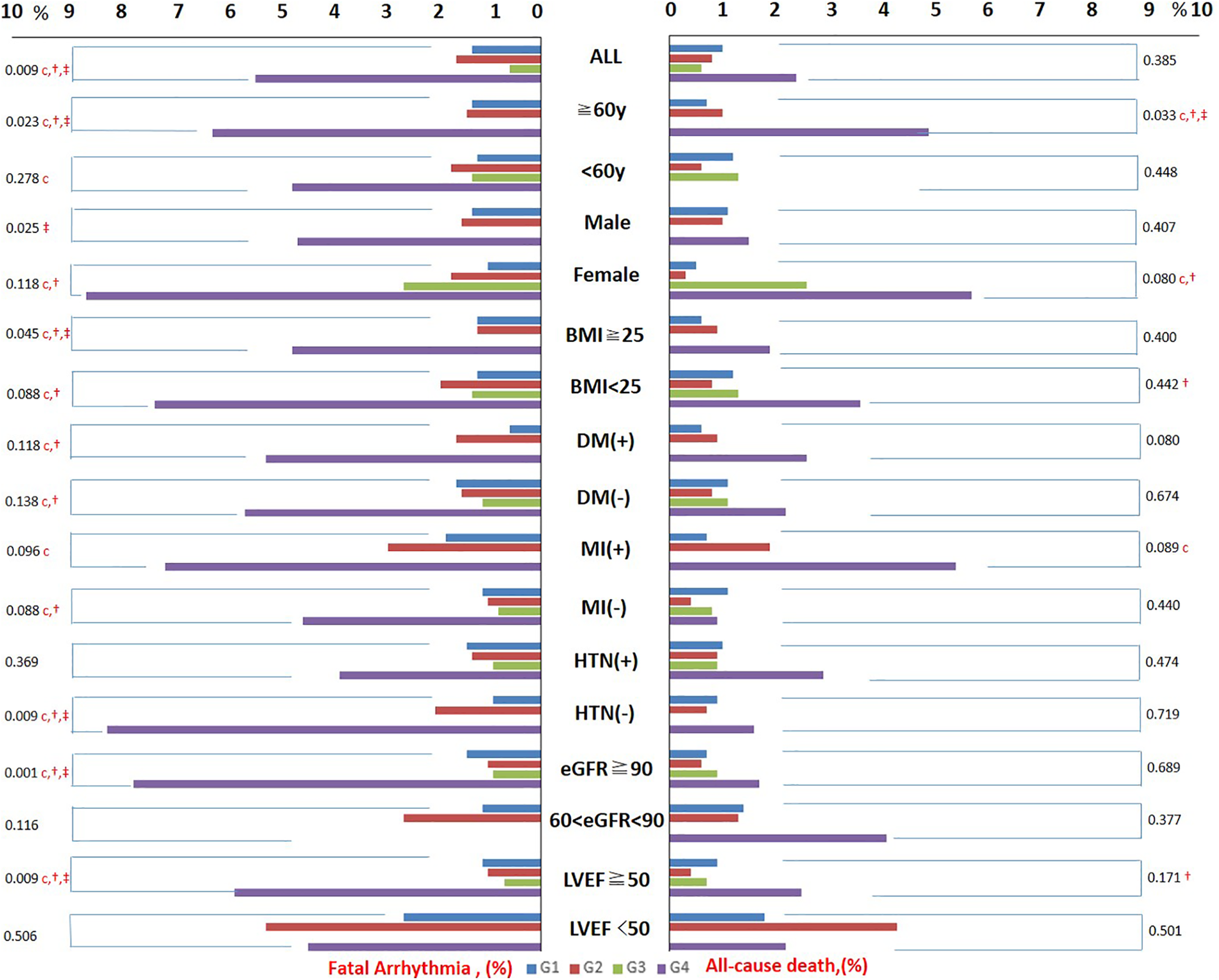 The incidence of adverse outcomes from G1 to G4 in the overall population and subgroups. Trends of in-hospital all-cause death and in-hospital fatal arrhythmia from G1 to G4 in all subgroups were similar. G4 had the highest incidence of in-hospital all-cause death and in-hospital fatal arrhythmia in most subgroups with or without significance. BMI, body mass index; HTN, hypertension; DM, diabetes mellitus; MI, myocardial infarction. The character “c” represents a significant difference between G1 and G4, “†” represents a significant difference between G2 and G4, and “‡” represents a significant difference between G3 and G4.