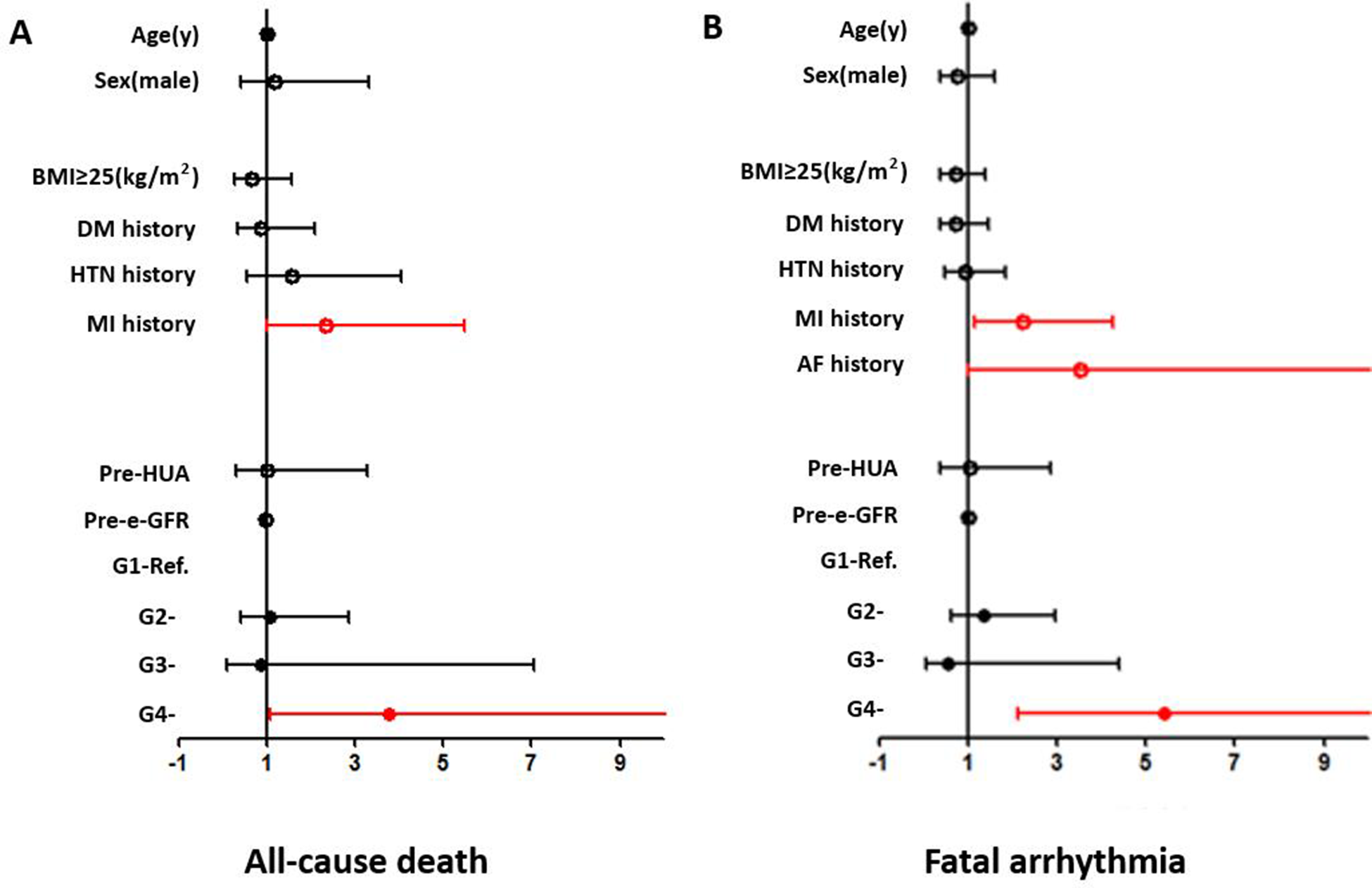 Age, gender, BMI ≥25 kg/m2, preoperative eGFR, HUA, HTN history, DM history, MI history, and perioperative SUA variation strata (G1–G4) were included as covariates. An SUA level increase of ≥30 µmol/L [G4, odds ratio (OR) = 3.771 (1.070–13.285) (G1 as reference), p = 0.039] and MI history [G4, OR = 2.352 (1.008–5.488), p = 0.048] were independent risk factors in the overall patients (shown in Figure 3).