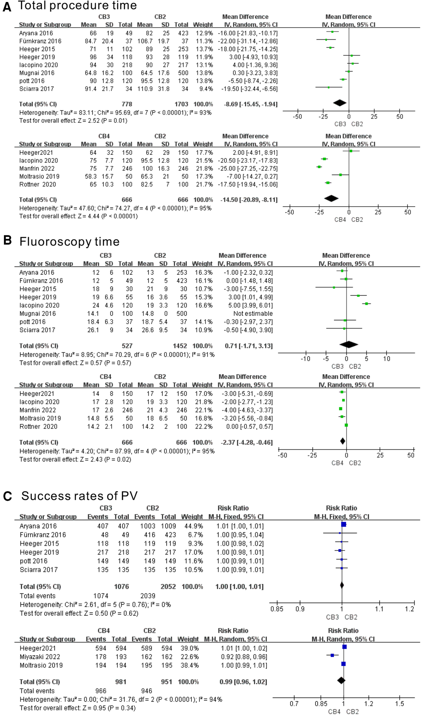 Forest plot of the outcome of total procedure time, fluoroscopy time, and success rate of PVI. (A) Total procedure time (min). (B) Fluoroscopy time (min). (C) Success rate of PVI. CB2, second-generation cryoballoon; CB3, third-generation cryoballoon; CB4, fourth-generation cryoballoon.