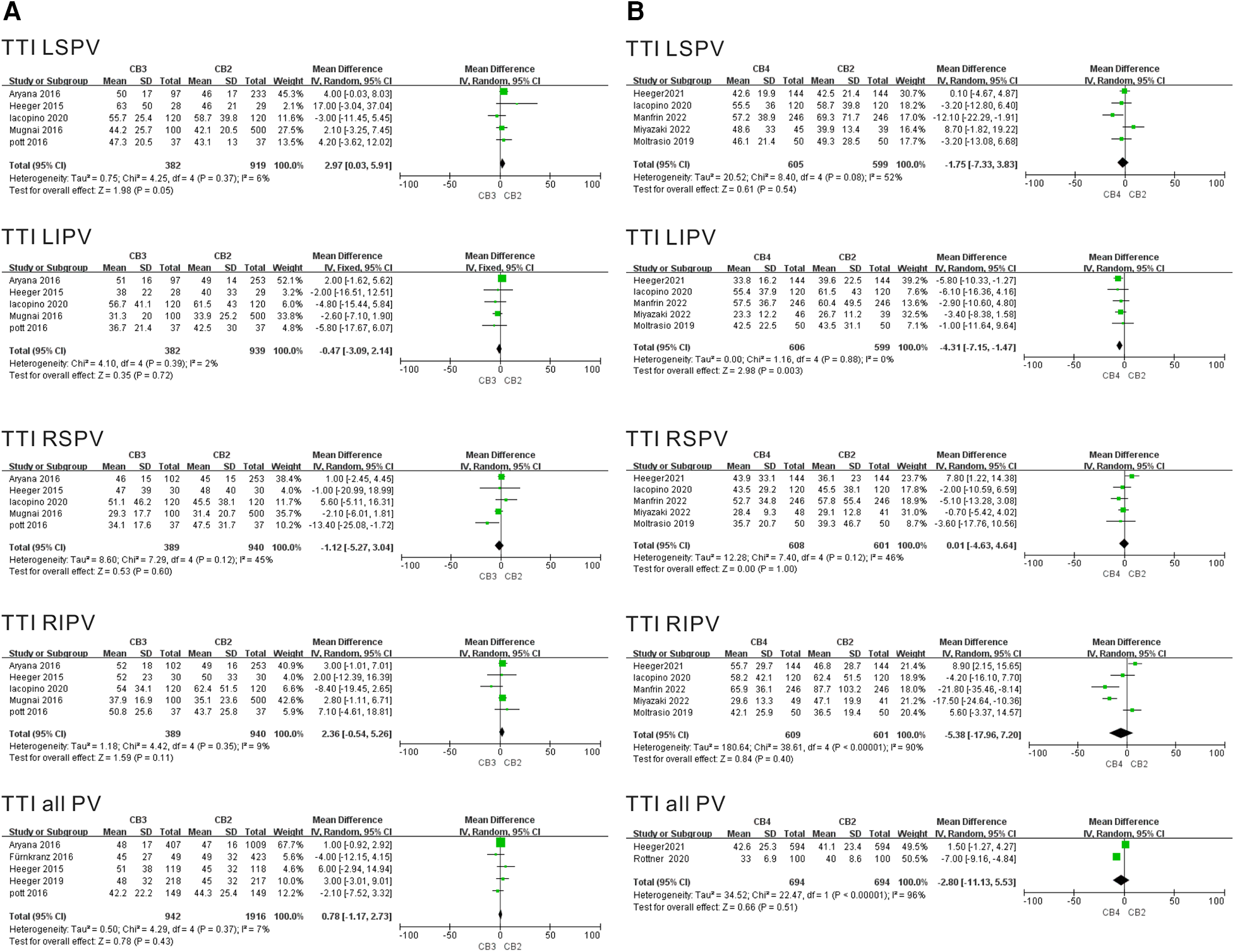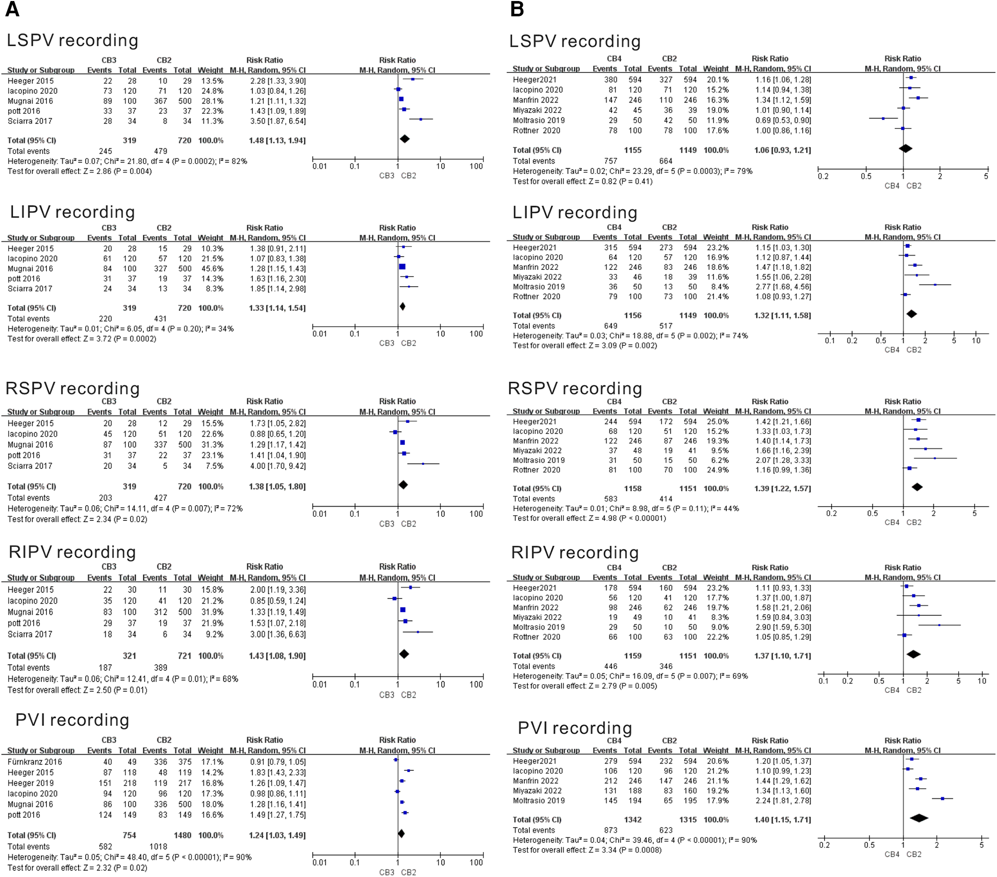 Forest plot of the outcome of real-time PVI recordings. (A) Real-time PVI recordings of CB3 vs. CB2. (B) Real-time PVI recordings of CB4 vs. CB2. CB2, second-generation cryoballoon; CB3, third-generation cryoballoon; CB4, fourth-generation cryoballoon.