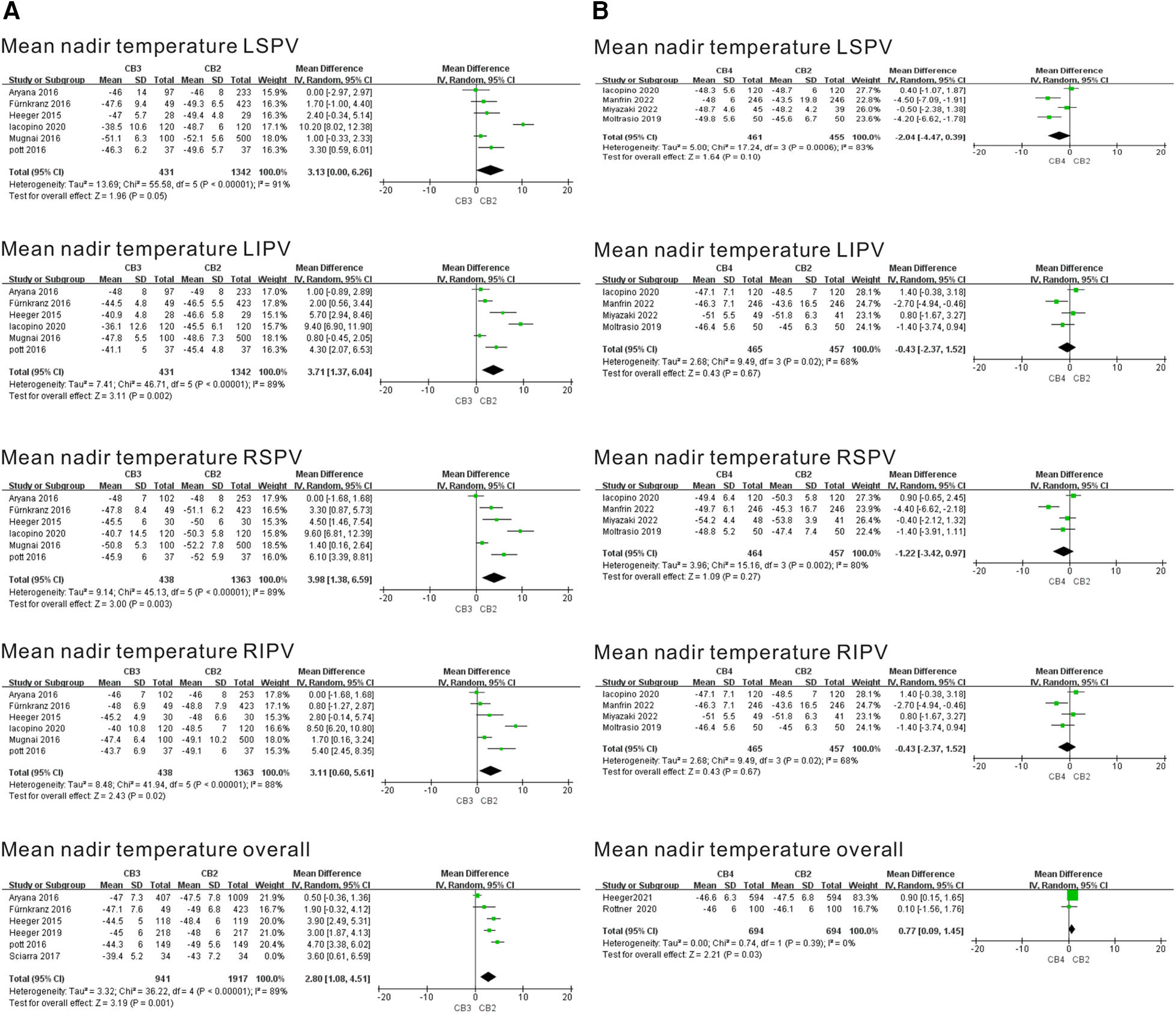 Forest plot of the outcome of mean nadir temperature. (A) Mean nadir temperature of CB3 vs. CB2 (°C). (B) Mean nadir temperature of CB4 vs. CB2 (°C). TTI, time-to-isolation; CB2, second-generation cryoballoon; CB3, third-generation cryoballoon; CB4, fourth-generation cryoballoon.