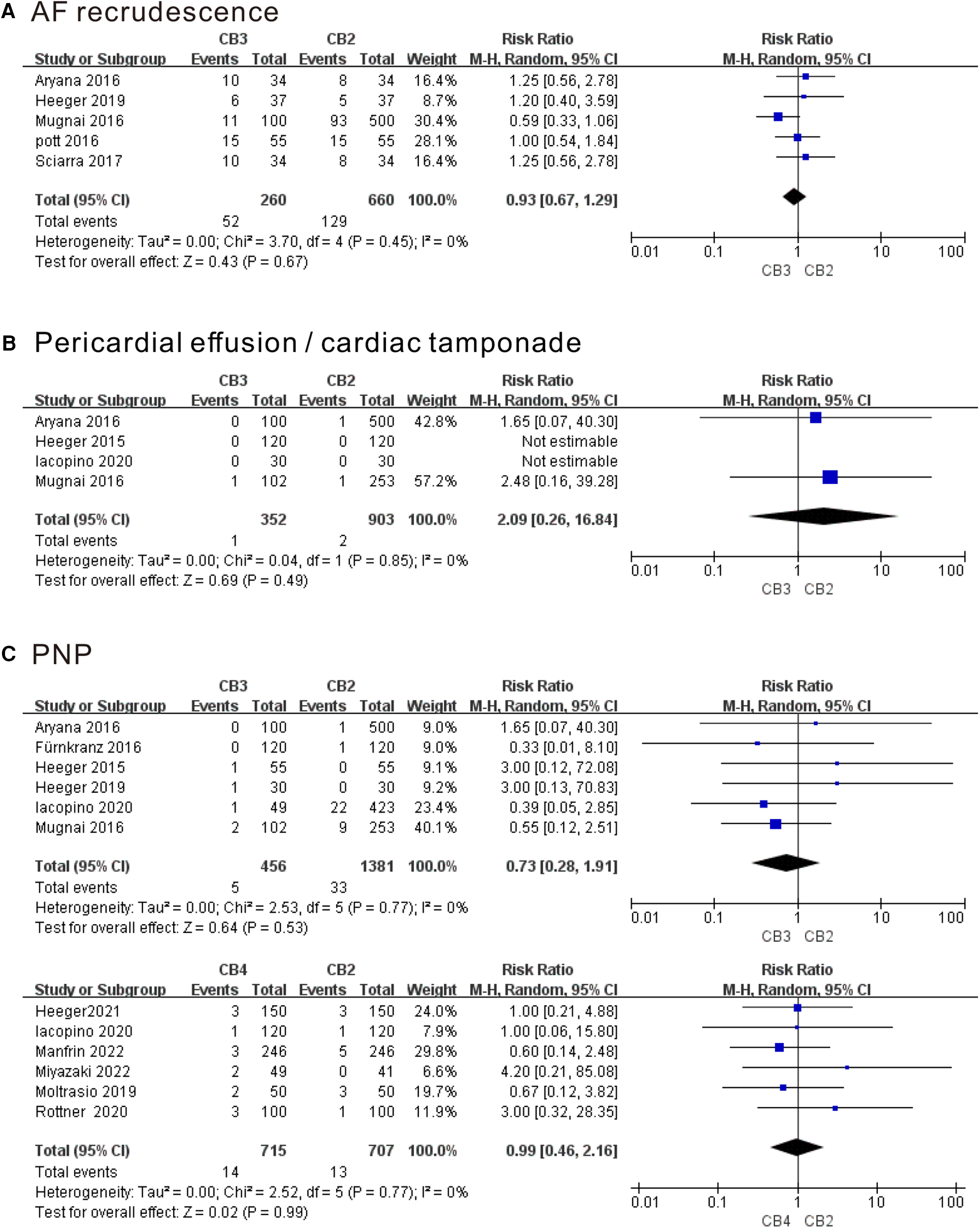 Forest plot of the outcome of AF recrudescence and complications. (A) AF recurrence. (B) Pericardial effusion/cardiac tamponade. (C) PNP. AF, atrial fibrillation; PNP, phrenic nerve palsy; CB2, second-generation cryoballoon; CB3, third-generation cryoballoon; CB4, fourth-generation cryoballoon.