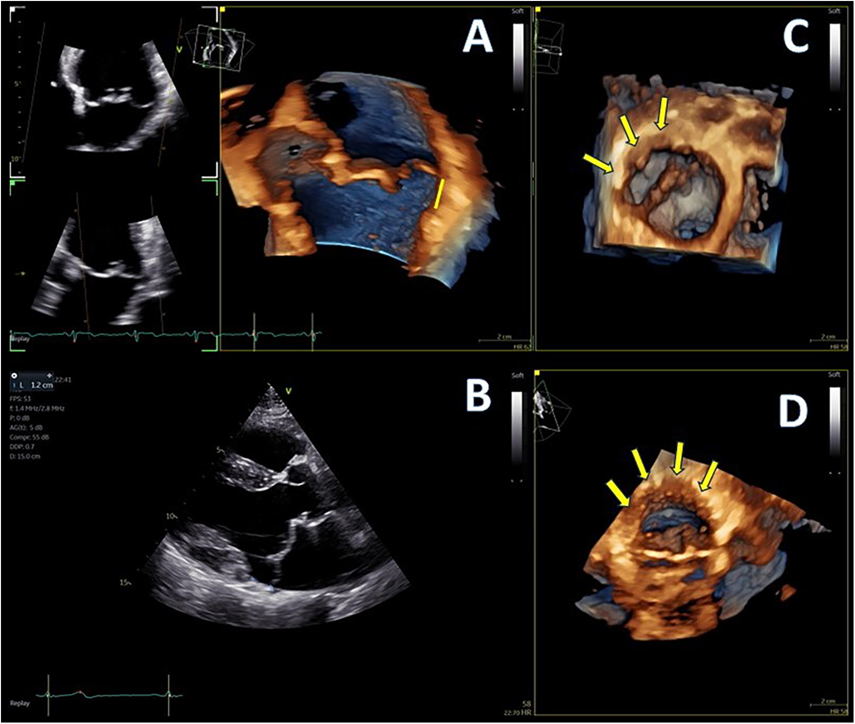 (A,B) Mitral annular disjunction (MAD) demonstrated by 4D and 2D transthoracic echocardiography (TTE), 12 mm of distance from posterior left ventricular (LV) wall, indicated with yellow line, and (C,D) extent of disjunction arc seen with two different orthogonal volume rendering views, indicated with yellow arrows.