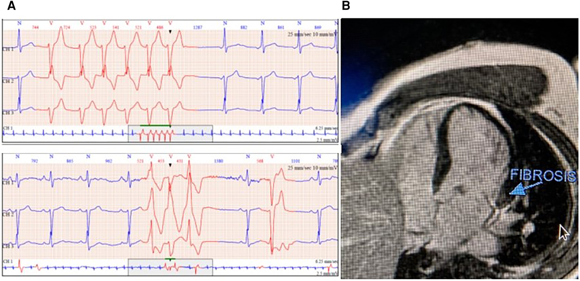 (A) Monomorphic and polymorphic ventricular tachycardia in 24 h ambulatory electrocardiogram (ECG) and (B) cardiac magnetic resonance imaging (CMR) with fibrosis detection of the basal inferolateral wall.