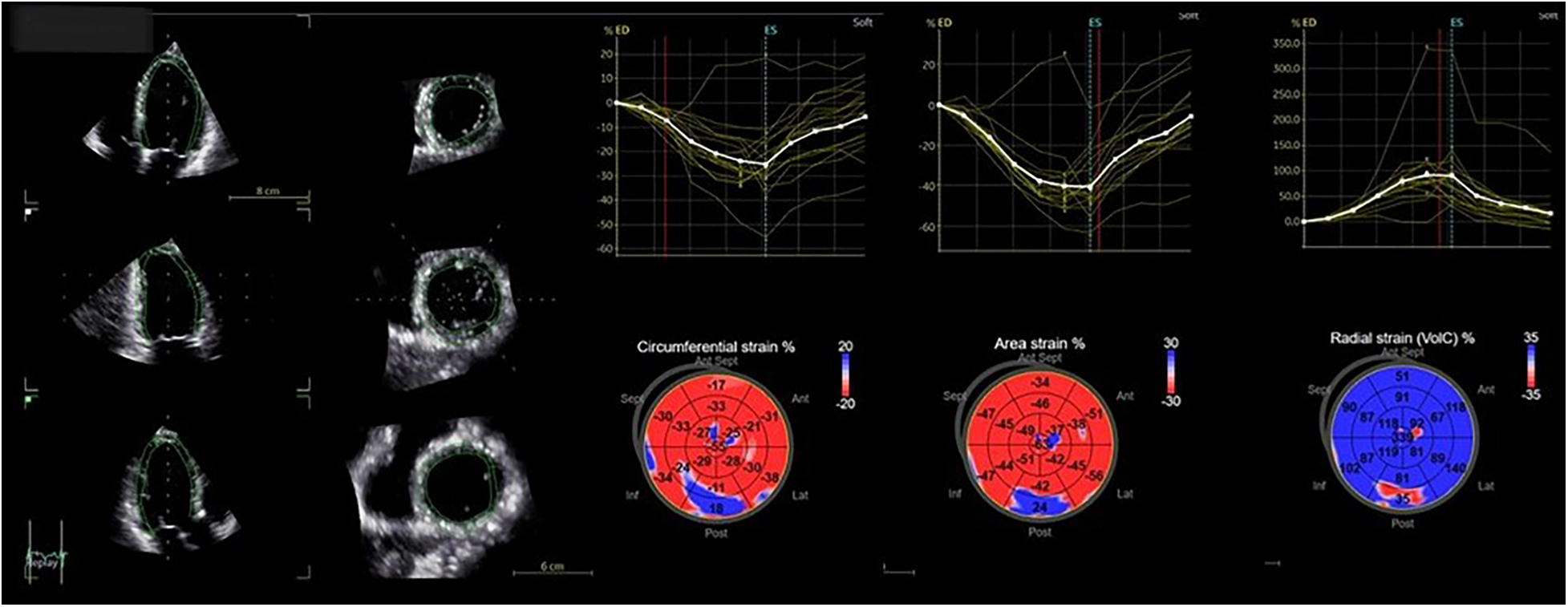 Advanced LV assessment and 4D strain analysis values were performed with the dedicated AutoLVQ application, using a full-volume apical four-chamber view, focused on the LV, with a frame rate of >25 vps. Global LV strain values were overall normal. The longitudinal strain was measured at −21%, circumferential strain at −20%, radial strain at 69%, and area strain at −40%. The strain values of the basal inferolateral segment were reduced, confirming the presence of the fibrosis detected in the MRI examination of the patient. The segmental radial strain was measured at 35% (normal values at 43.2 ± 4.5%), area strain at 24% (−36.5 ± 3.9%) (with adjacent segmental values of −47 and −56%), and circumferential strain at 18% (−30.3 ± 4.0%), while the longitudinal strain was preserved at −22% (−21 ± 0.6%) due to the hyperdynamic motion of the basal posterior wall (16) (Figure 3).