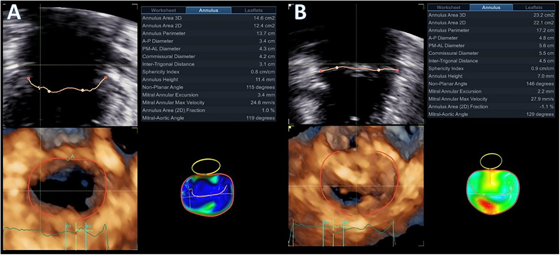 Diastolic (A) and systolic (B) mitral valve quantification (MVQ) models showing the dynamic changes and the systolic expansion and flattening of the mitral annulus.