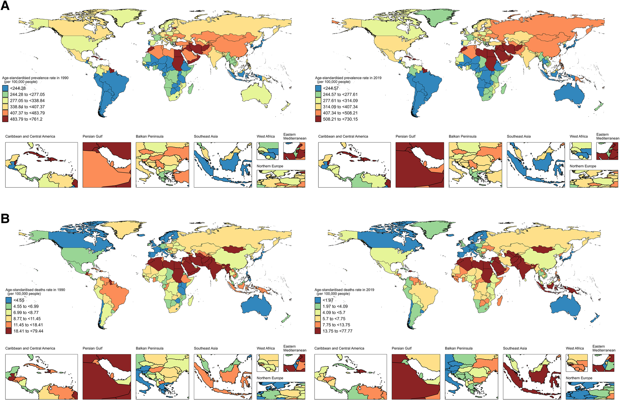 World map of ASPR (A) and ASDR (B) of IHD in WCBA in 1990 and 2019. ASPR, age-standardized prevalence rate; ASDR, age-standardized death rate; IHD, ischemic heart disease; WCBA, women of childbearing age.