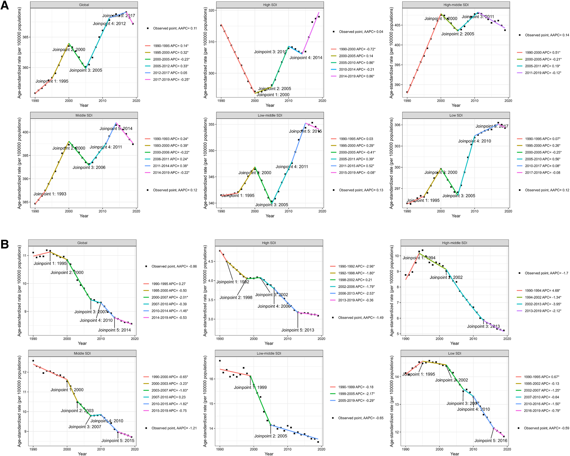 Joinpoint regression analysis of ASPR (A) and ASDR (B) of IHD in WCBA at the global and five SDI levels from 1990 to 2019. ASPR, age-standardized prevalence rate; ASDR, age-standardized death rate; IHD, ischemic heart disease; WCBA, women of childbearing age. P-value *P < 0.05.