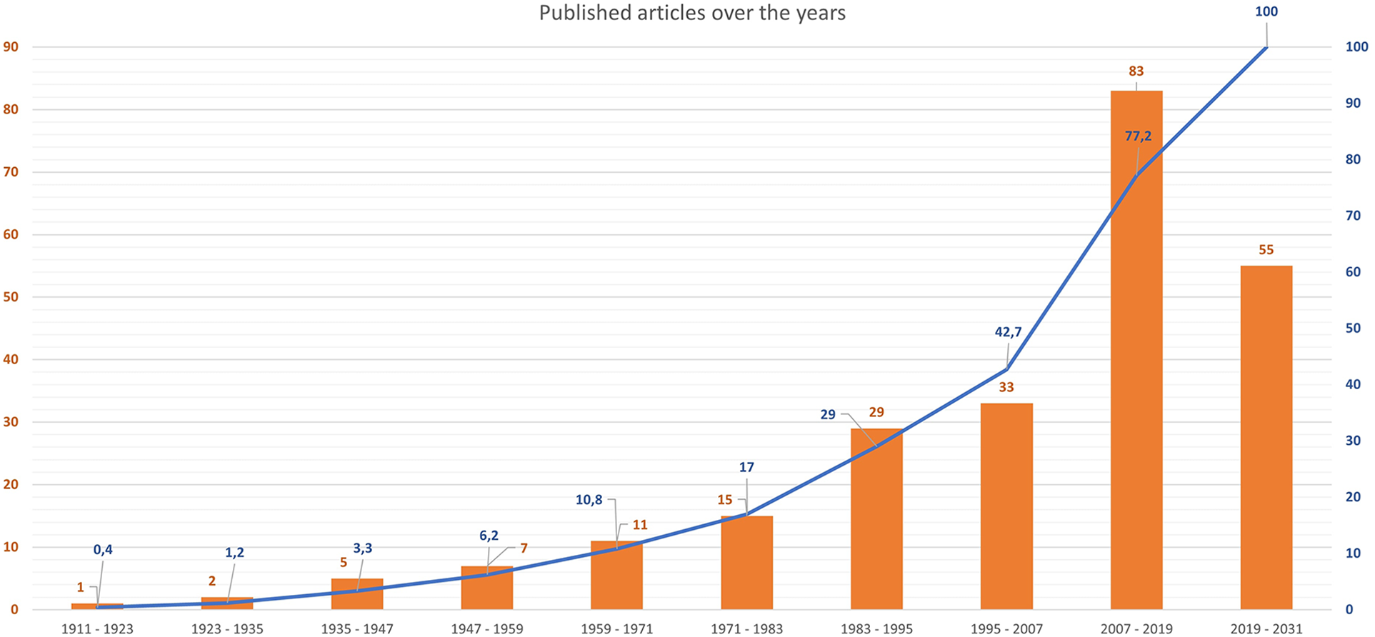 Timeline of published articles on MC. Bars show absolute numbers of published articles, while the overlay line in blue shows cumulative percentages (%).