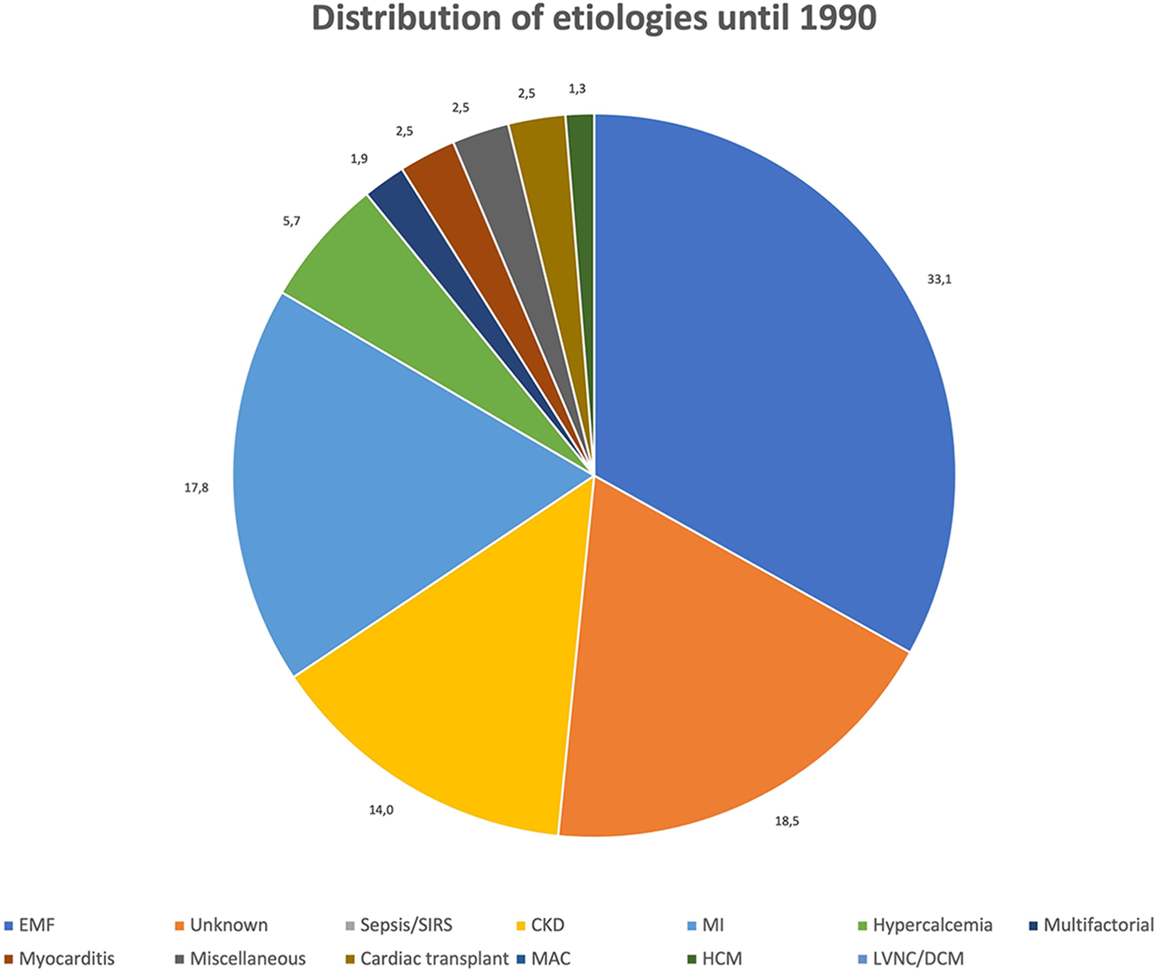 Distribution of etiologies until 1990. Values expressed as percentages (%).