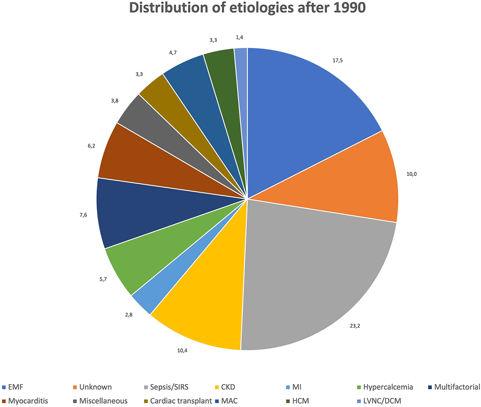 This different prevalence remains more or less stable across decades, even if the relative distribution of specific etiologies varies throughout the years. In particular, while in the past EMF followed by MI and CKD appeared to be the most common causes of MC, after 1991 sepsis/SIRS becomes the most frequently reported etiology, followed by EMF and CKD.