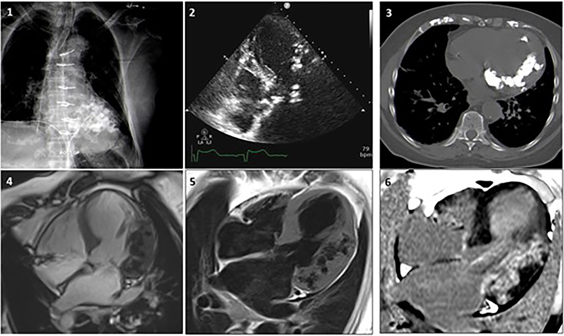 Case 1. A woman, 80 year-old, with CAD underwent revascularization through coronary artery bypass grafiting. (1) Chest x-ray showing a diffuse hypodense lobulated area in the left ventricle. (2) Echocardiogram revealing diffuse aortic and mitral calcifications with mild stenosis, marked septum and antero-lateral asymmetric hypertrophy, with extensive antero-lateral calcifications. (3) Non-contrast CT MPR axial-view presents widespread calcifications in the left ventricular wall extended to the mitral-aortic annulus and both coronary arteries. (4) CMR SSFP 4-chamber view showing lateral and antero-lateral wall thickening with areas of intra-myocardial low signal, surrounded by normal myocardium. Coronary angiography documented significant disease that required revascularization. (5) FSE T1 weighted-spin-echo4-chamber view is confirming the localization of lateral and anterolateral wall thickening with areas of low-signal. (6) After contrast gadolinium injection an extensive area of intra-myocardial hypersignal (hyperenhancement) is shown in the lateral wall. Adapted with permission from Sozzi et al. (21), licensed under CC BY 4.0.