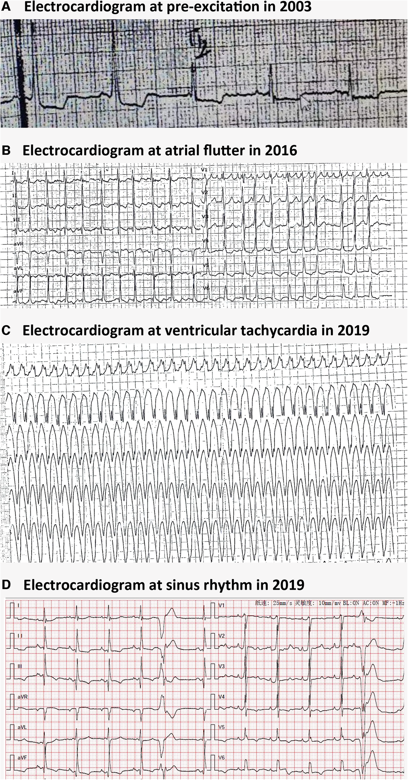 Electrocardiographic findings in Danon disease. (A) Electrocardiogram at pre-excitation in 2003. (B) Electrocardiogram at atrial flutter in 2016. (C) Electrocardiogram at ventricular tachycardia in 2016. (D) Electrocardiogram at sinus rhythm with ventricular premature beats and a complete left bundle branch block in 2019.