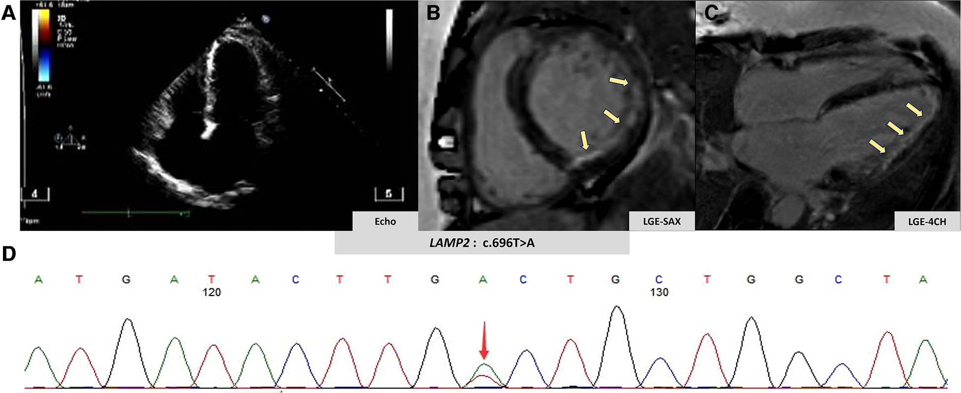 Imaging and genetic findings in Danon disease. (A) Patient's echocardiography view. (B,C) Patient's late gadolinium enhancement by CMR (yellow arrow). (D) Genetic analysis of the clinically affected member.