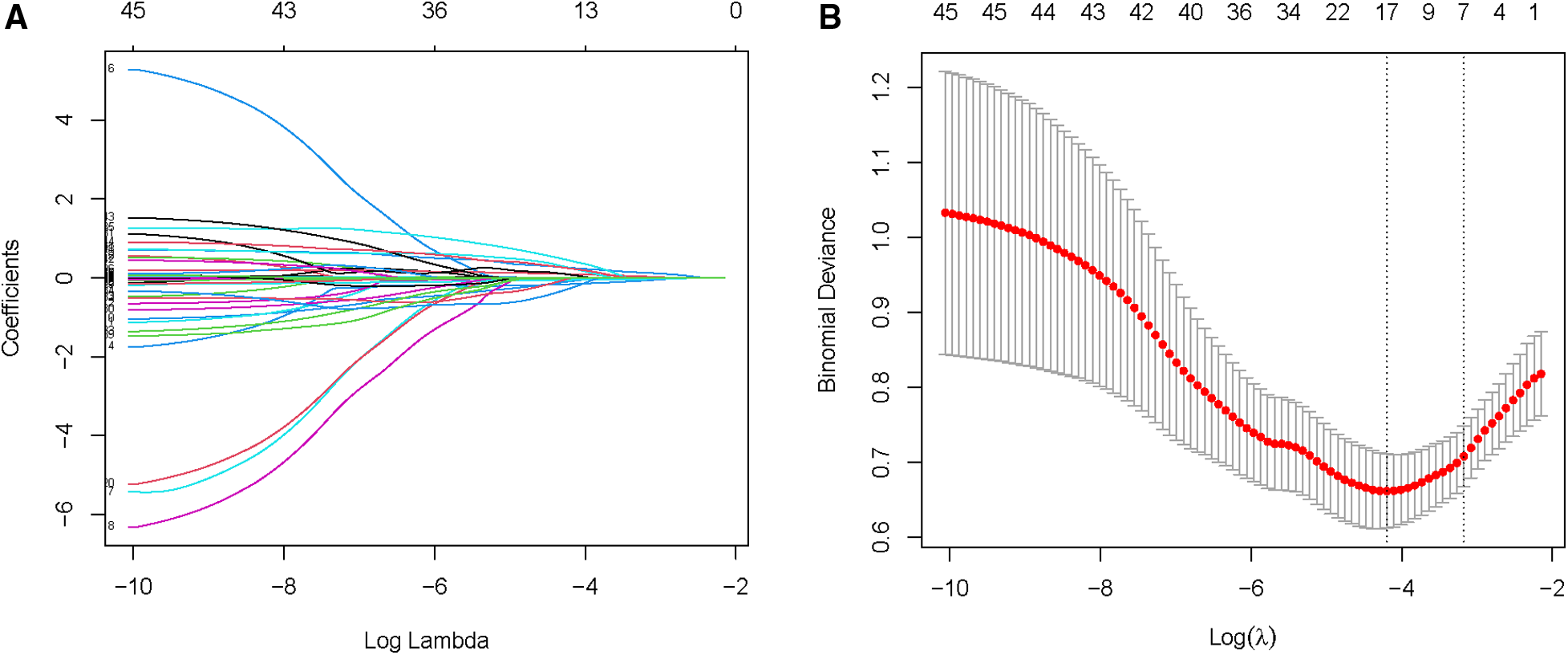 Selection of NOAF risk factors using the LASSO regression method. (A) LASSO coefficient profiles of the 45 texture features. A coefficient profile plot is produced against the log (λ) sequence. (B) LASSO regression model 10-fold cross-validation plot. Draw a vertical line at the optimum with the minimum criterion and 1se of the minimum criterion. When λ = 0.040, we get 7 variables for further analysis.