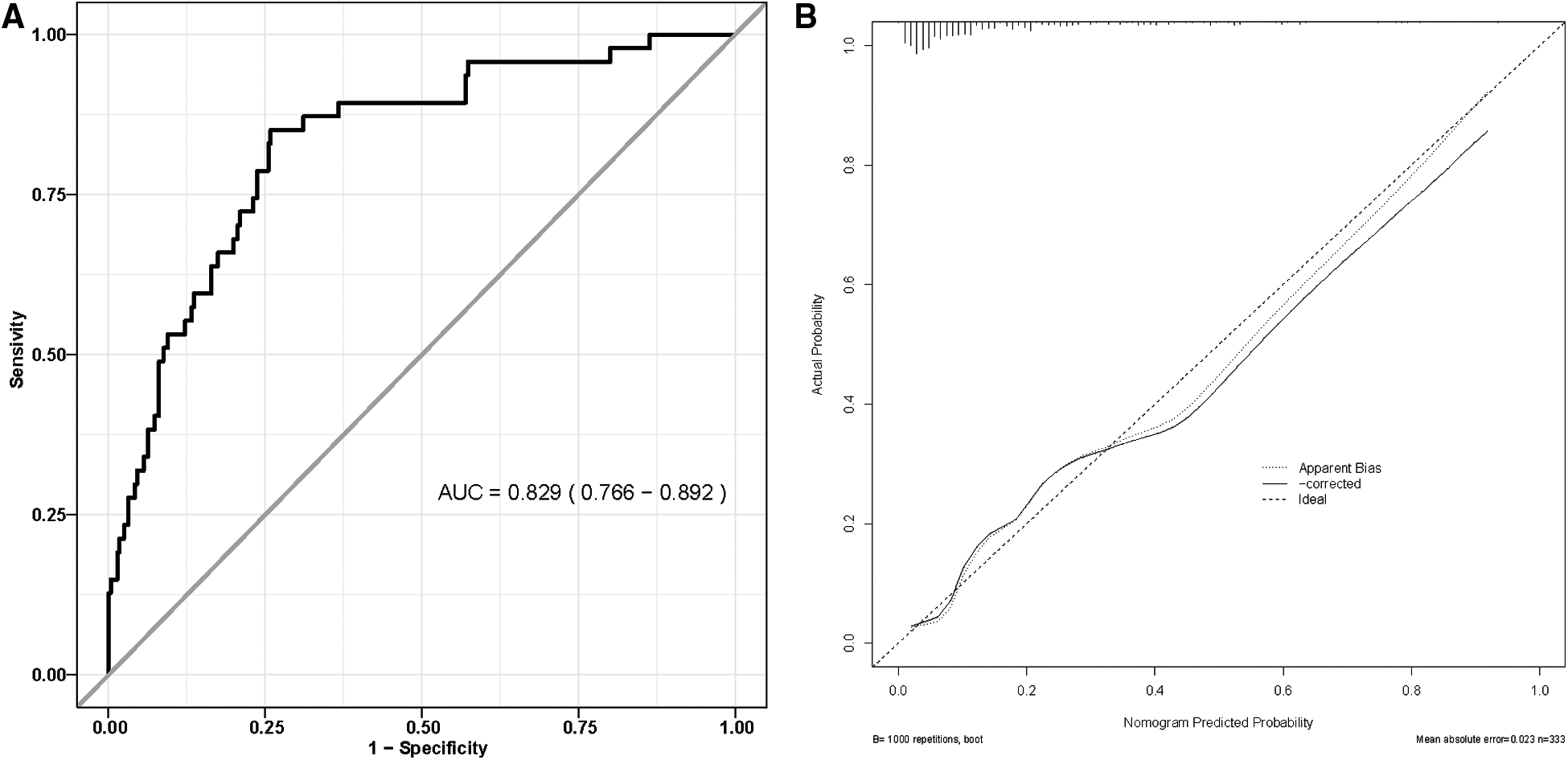 Overall, 47 patients (14.1%) developed NOAF. Four variables, including left atrial dimension, body mass index (BMI), CHA2DS2-VASc score, and prognostic nutritional index, were selected to construct a nomogram. Its area under the curve is 0.829, and internal validation by 10-fold cross-folding indicated a mean area under the curve is 0.818. The model demonstrated good calibration according to the Hosmer-Lemeshow test (P = 0.199) and the calibration curve. It showed satisfactory clinical practicability in the decision curve analyses and clinical impact curve.
