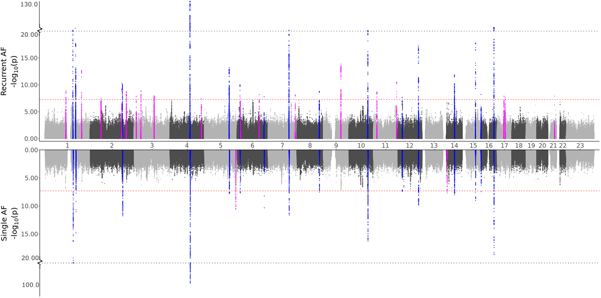 To test our hypothesis that patients experiencing recurrent AF events are more genetically susceptible than patients experiencing single AF events, we perform three GWAS meta-analyses (see Methods). The GWAS meta-analysis comparing single to recurrent AF events found no regions with significantly different effects. Some SNPs were identified to be of genome-wide significance in the HUNT population, but these were rare variants (MAF ), and we removed them through filtering prior to the meta-analysis. Comparing the GWAS meta-analyses of each group against healthy controls (Table 2 and Figure 1), we find that 18 regions are specifically associated with recurrent AF events: 2 are specifically associated with single AF events and 16 are identified in both GWAS investigations. Many regions comprise multiple SNPs that exhibit significant effects in only one of the study groups. Five regions identified in the recurrent AF GWAS study consist of only one SNP, yet these are identified with similarly strong effects in both the HUNT and the UKBB studies, indicating a genuine association. Regional plots of the single SNP hits uniquely associated with recurrent AF are shown in Supplementary File 1, Figures S15–S19. The presented results show that more than half of the identified regions are specifically linked to single or recurrent AF, supporting the hypothesis that patients who have experienced recurrent AF events are genetically more susceptible than those who have only experienced one event and survived it.