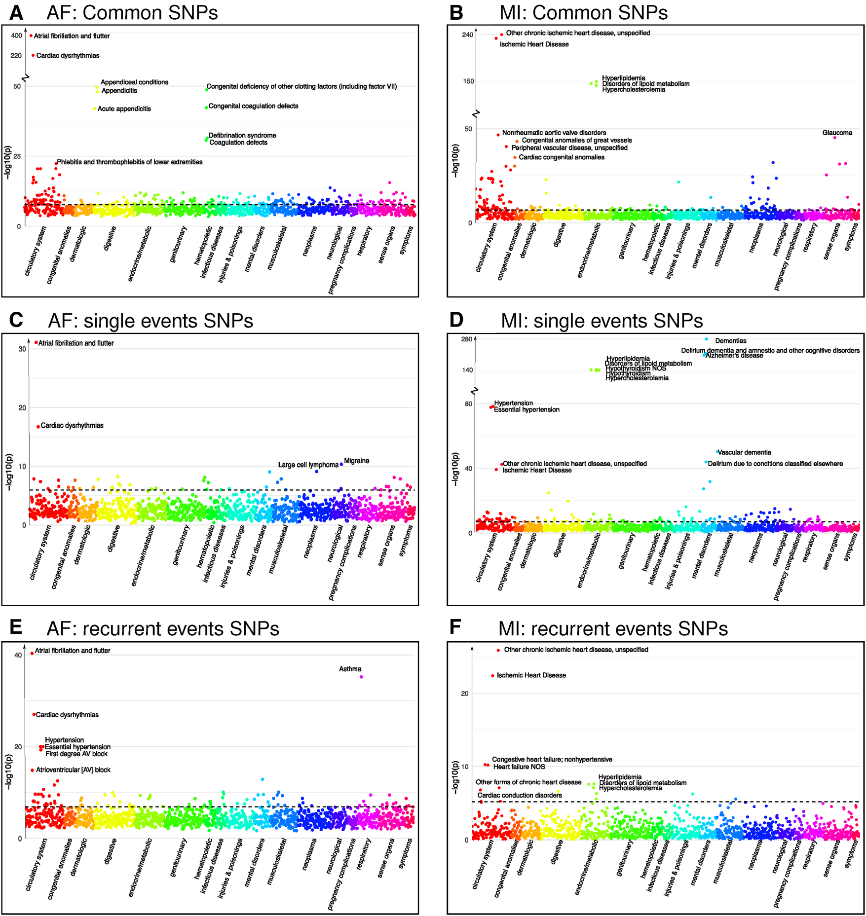 Phenome-wide association studies (PheWAS) were performed on all SNPs from the meta-analyses reaching genome-wide significance. From the comprehensive Pan UKBB resource (26), we collected results from GWAS conducted on 1,326 phenocodes, and we identified the effect of each of our SNPs of interest on each phenocode. All GWAS results from the Pan UKBB are based on UKBB participants, and we selected results for European ancestry exclusively. For each set of SNPs (identified in common or specifically for either single or recurrent AF/MI), phenotypes with a -value , where is the number of SNPs in the set, were considered significant associations. For simplicity, only the SNP with the lowest -value for each phenotype was selected from each set of SNPs.