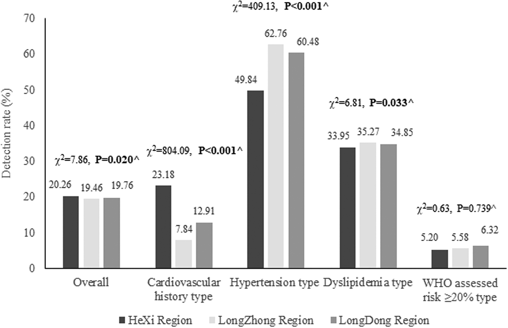 Of the 100,082 residents included, 21,059 were identified as subjects at high-risk for CVD. The overall prevalence rate of subjects at high risk for CVD was 19.7%, and the prevalence rate in the HeXi region was greater than that in the LongZhong and LongDong regions. The prevalence rates were 14.0%, 58.2%, 34.9%, and 5.7% for cardiovascular history, hypertension, dyslipidemia, and WHO-assessed risk ≥20%, respectively. The prevalence rate of cardiovascular history type was the highest in the HeXi region, hypertension and dyslipidemia types were the highest in the LongZhong region, and WHO-assessed risk ≥20% type was the highest in the LongDong region. Male, higher education level, smoking status, snoring status, overweight and obesity status, central obesity status, and disease history were more likely to be risk factors for subjects at high risk for CVD. There were some differences among different regions in age, annual household income, farming status, rural/urban status, and drinking status.