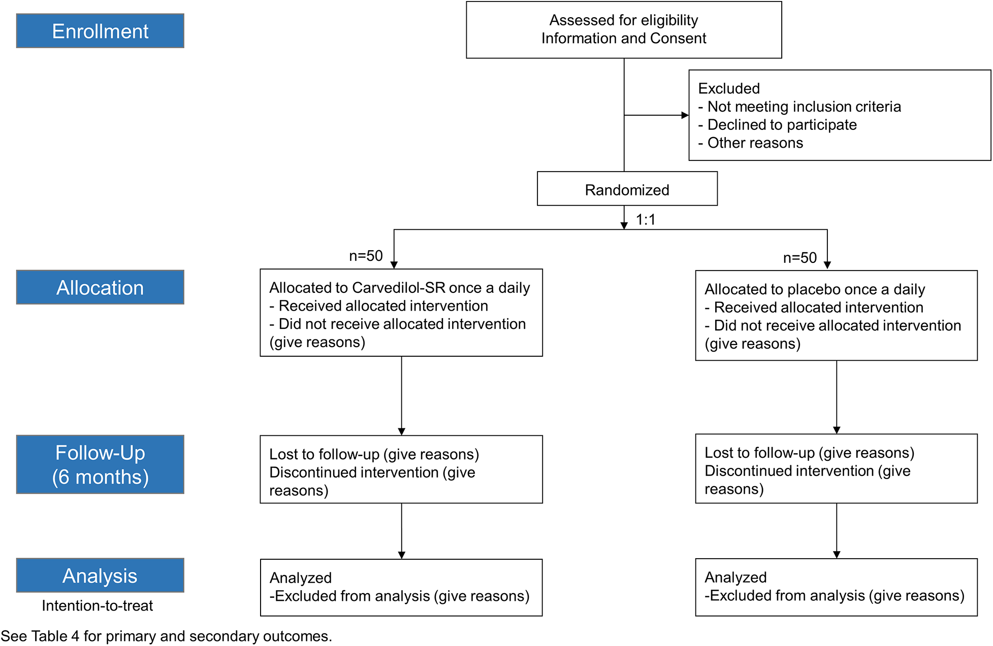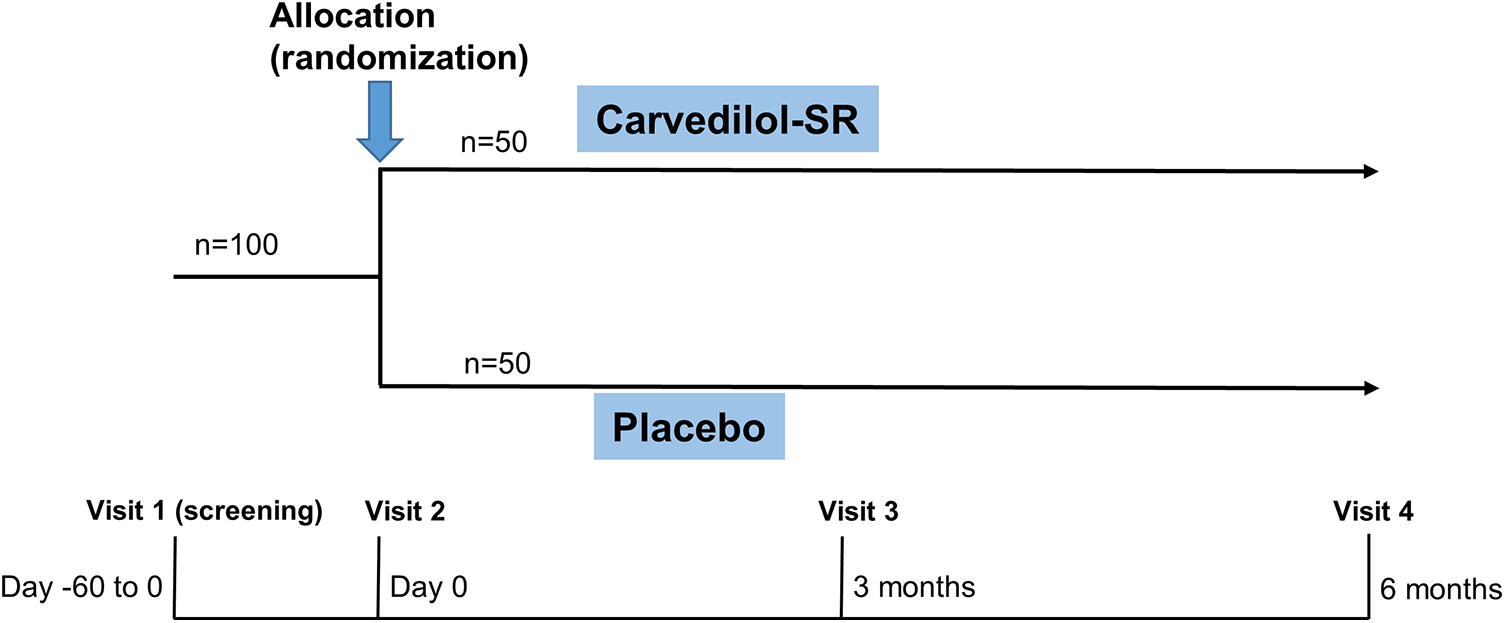 Potential participants will be screened (visit 1) on an outpatient or inpatient basis (Figure 2). After a comprehensive interview, eligible participants will be asked to provide written informed consent to participate in the trial. A baseline survey of eligible participants covering demographics and cardiovascular comorbidities will be conducted by research nurses (Table 2). Then, using a web-based central randomization service (http://matrixmdr.com), eligible participants will then be randomly assigned to either the carvedilol-SR group or the placebo group in a 1:1 ratio (visit 2). The randomization block will be generated by an independent statistician unrelated to this study using the SAS randomization program.