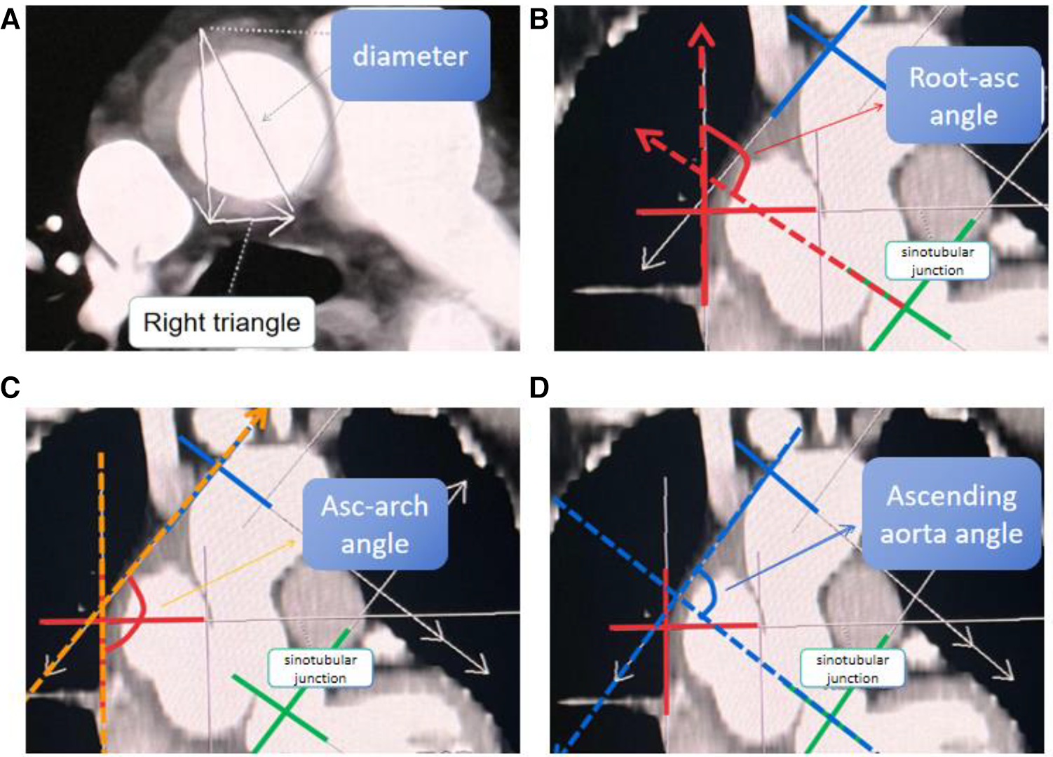 Measurement of the MAD of the ascending aorta and measurement of the “three angles” of the aorta. (A) Diameter of Aortic: the MAD of the aorta between the sinotubular junction and the starting plane of the innominate artery. (B) The root-asc angle: the angle between the vertical line of the sinotubular junction plane and the vertical line of the aortic cross-section at the midpoint of the main pulmonary artery. (C) The asc-arch angle: the angle between the vertical line of the aortic cross-section at the level of the brachiocephalic artery and the vertical line of the aortic cross-section at the midpoint of the main pulmonary artery. (D) Ascending aorta angle: the angle between the vertical line of the ascending aorta's junction plane and the vertical line of the aortic transverse plane at the level of the brachiocephalic artery.