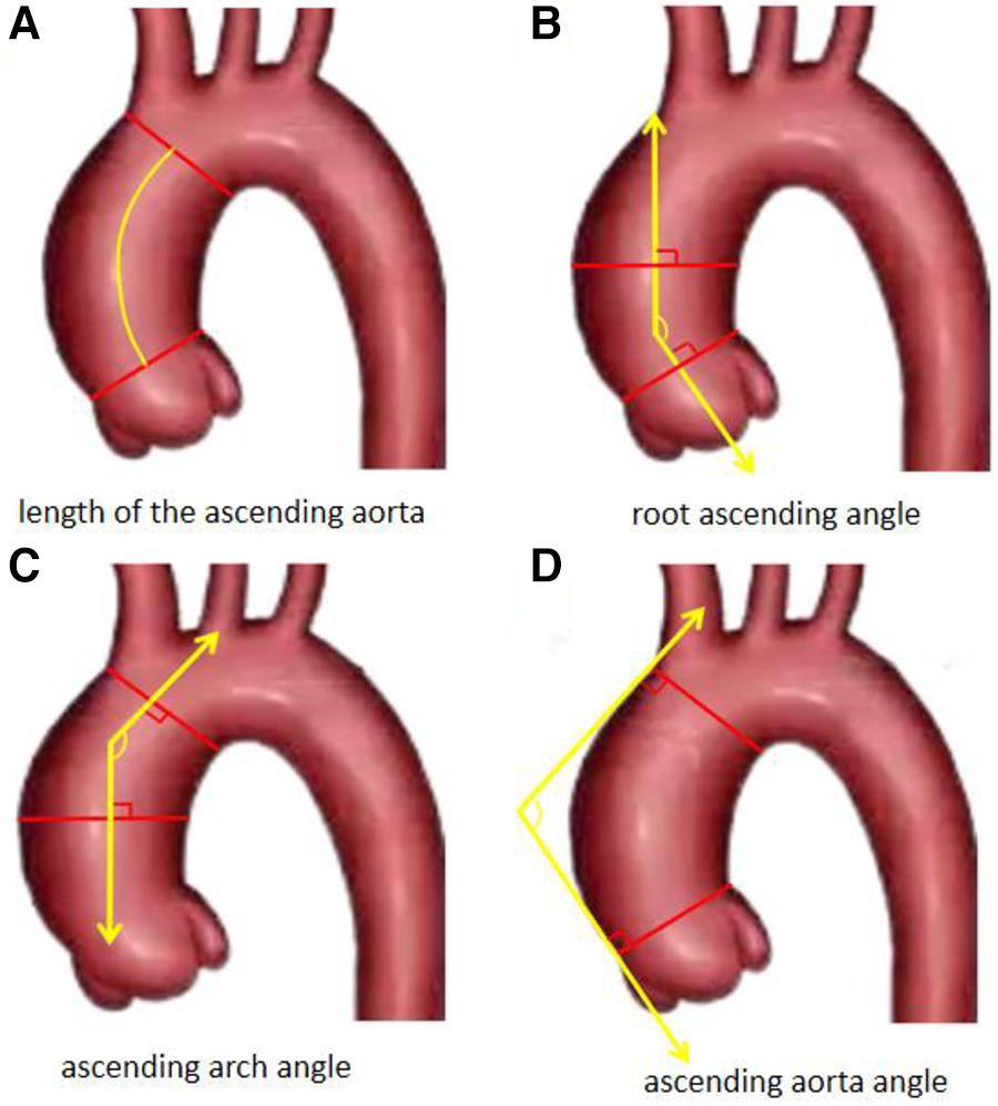 The ascending aortic angle is defined as the angle between the vertical line of the ascending aorta's junction plane and the vertical line of the aortic transverse plane at the level of the brachiocephalic artery. The root ascending angle (root-asc angle) is determined by the angle between the vertical line of the sinotubular junction plane and the vertical line of the aortic cross-section at the midpoint of the main pulmonary artery. Similarly, the asc-arch angle is defined as the angle between the vertical line of the aortic cross-section at the level of the brachiocephalic artery and the vertical line of the aortic cross-section at the midpoint of the main pulmonary artery. Aortic related angles refer to measurement methods in previous studies (14), as shown in Figures 1, 2. We have decided to use rylski's criteria (17) to infer the morphological indicators of the aorta before the occurrence of ATAAD. After the occurrence of ATAAD, the MAD of the ascending aorta increased by 30%, and the LAA increased by 5%.