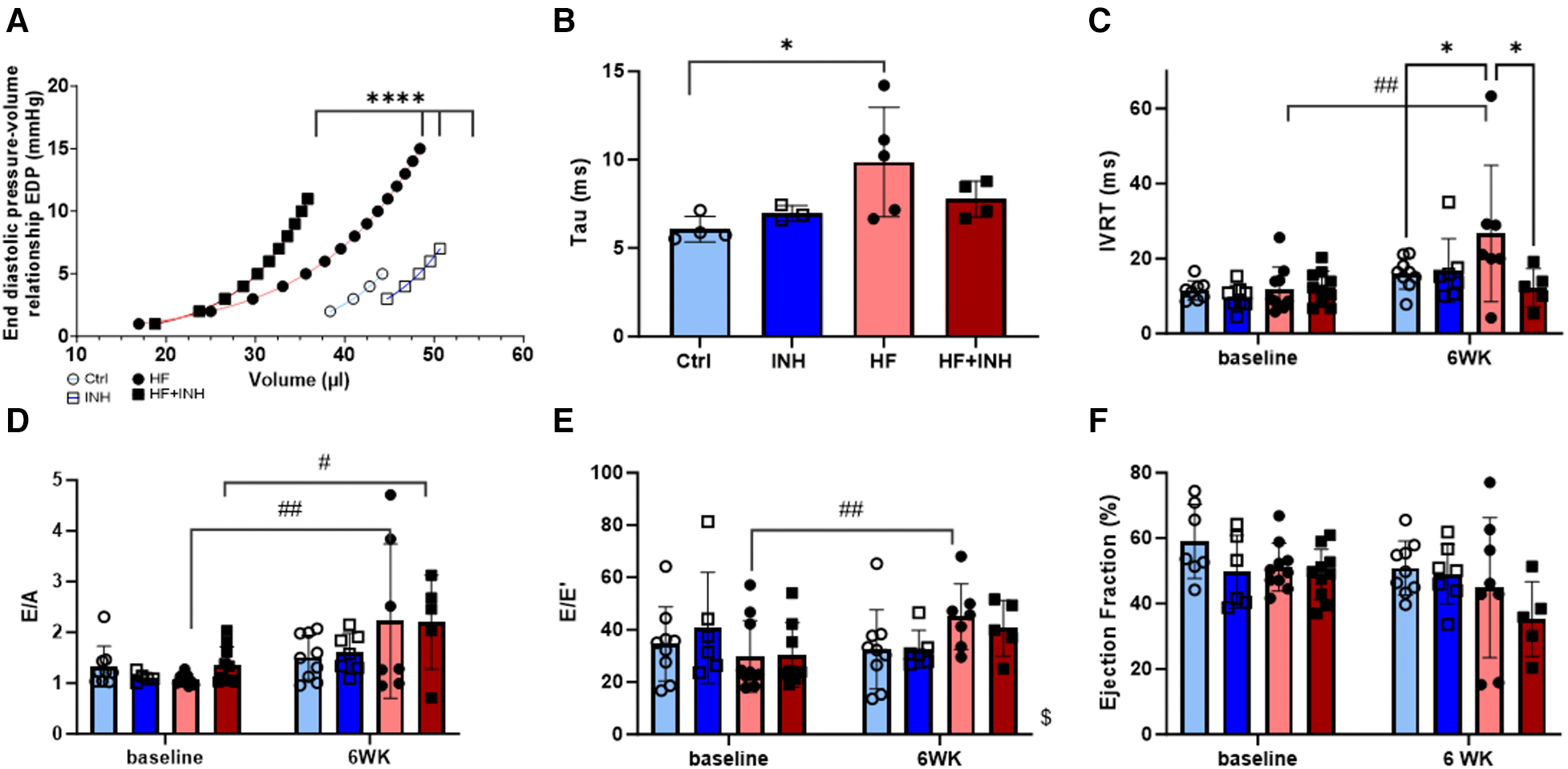 Cardiac function determined by invasive hemodynamics and echocardiography. Invasive hemodynamics validate diastolic dysfunction in HF mice with (A) leftwards shift of end diastolic pressure volume curve, and (B) increase of relaxation constant tau. Echocardiographic measures of diastolic dysfunction in HF mice illustrate an increase of (C) isovolumic relaxation time (IVRT), (D) E/A ratio over a period of six weeks— E/A represents the early (E) and late (A) ventricular filling velocities— and (E) E/e’ ratio over a period of six weeks — E/e’ represents the early mitral inflow over early mitral annular diastolic velocity. (F) Ejection fraction. N = 3-5 per group for invasive hemodynamics, N = 5-10 per group for echocardiography. Mixed-effect model for repeated measurements over time with Tukey's test or Šidák test for multiple comparisons. Two-way ANOVA with Šidák test for multiple corrections for single measurements. Non-linear regression with least square fit for edpvr curves. Mean ± SD, *p < 0.05, ****p < 0.0001, #p < 0.05 with baseline, ##p < 0.002 with baseline, $p < 0.05 interaction time × treatment. WK, week; IVRT, isovolumic relaxation time; EDP, end diastolic pressure; LV, left ventricular.