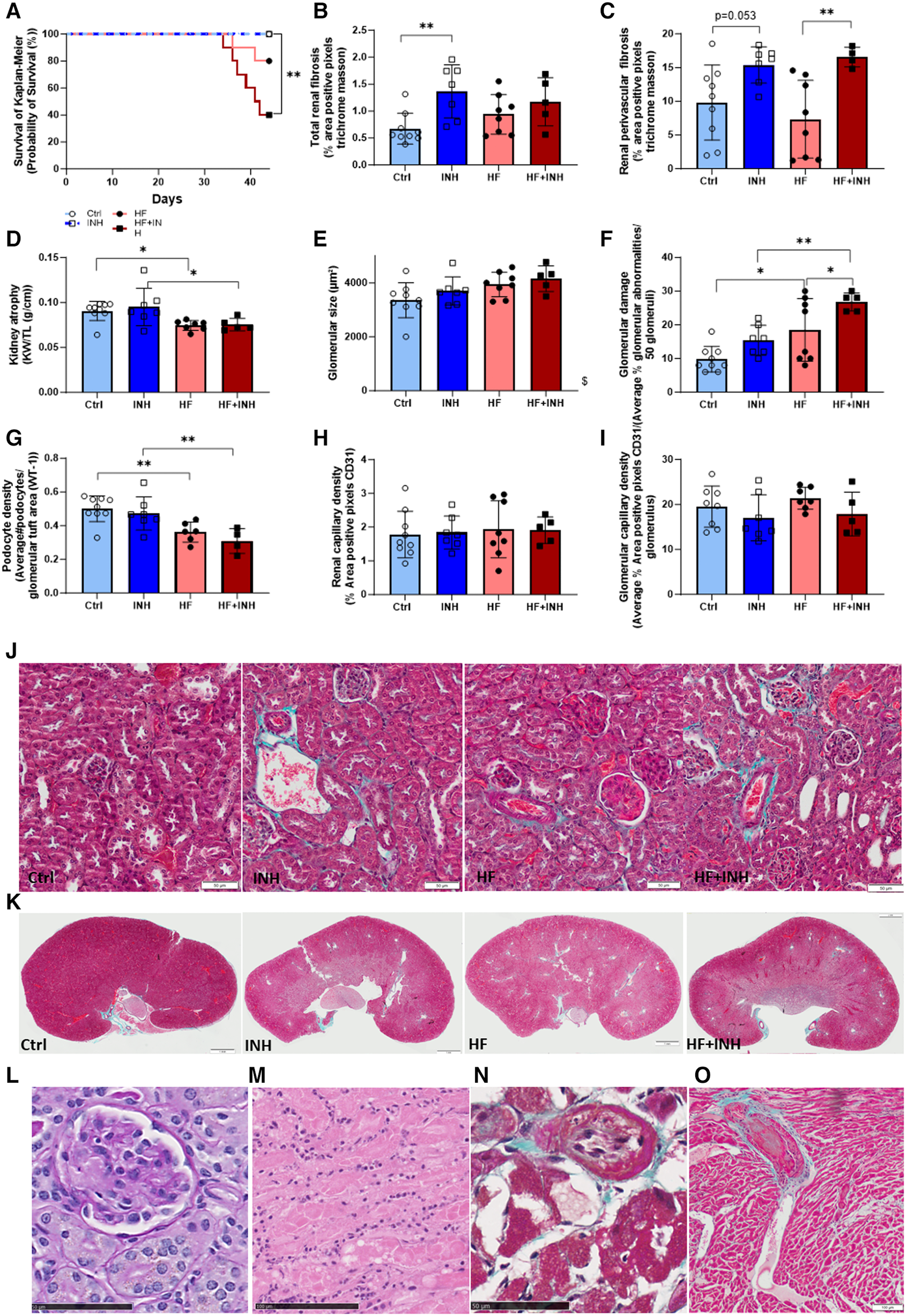 Renal interstitial and perivascular fibrosis was similar between Ctrl and HF mice (interstitial fibrosis: Ctrl 0.68 ± 0.29%, HF 0.94 ± 0.37%, p = 0.33; perivascular fibrosis: Ctrl 9.80 ± 5.56%, HF 7.35 ± 5.76%, p = 0.5). However, interstitial fibrosis significantly increased by inhibitor treatment in healthy mice, and to a lesser extent in HF conditions (interstitial: INH 1.37 ± 0.49%, p = 0.0036 vs. Ctrl; HF + INH 1.17 ± 0.45%, p = 0.5 vs. HF). We found large areas of perivascular fibrosis in all inhibitor-treated groups (INH 15.38 ± 2.70%, p = 0.053 vs. Ctrl; HF + INH 16.56 ± 1.46%, p = 0.008 vs. HF).