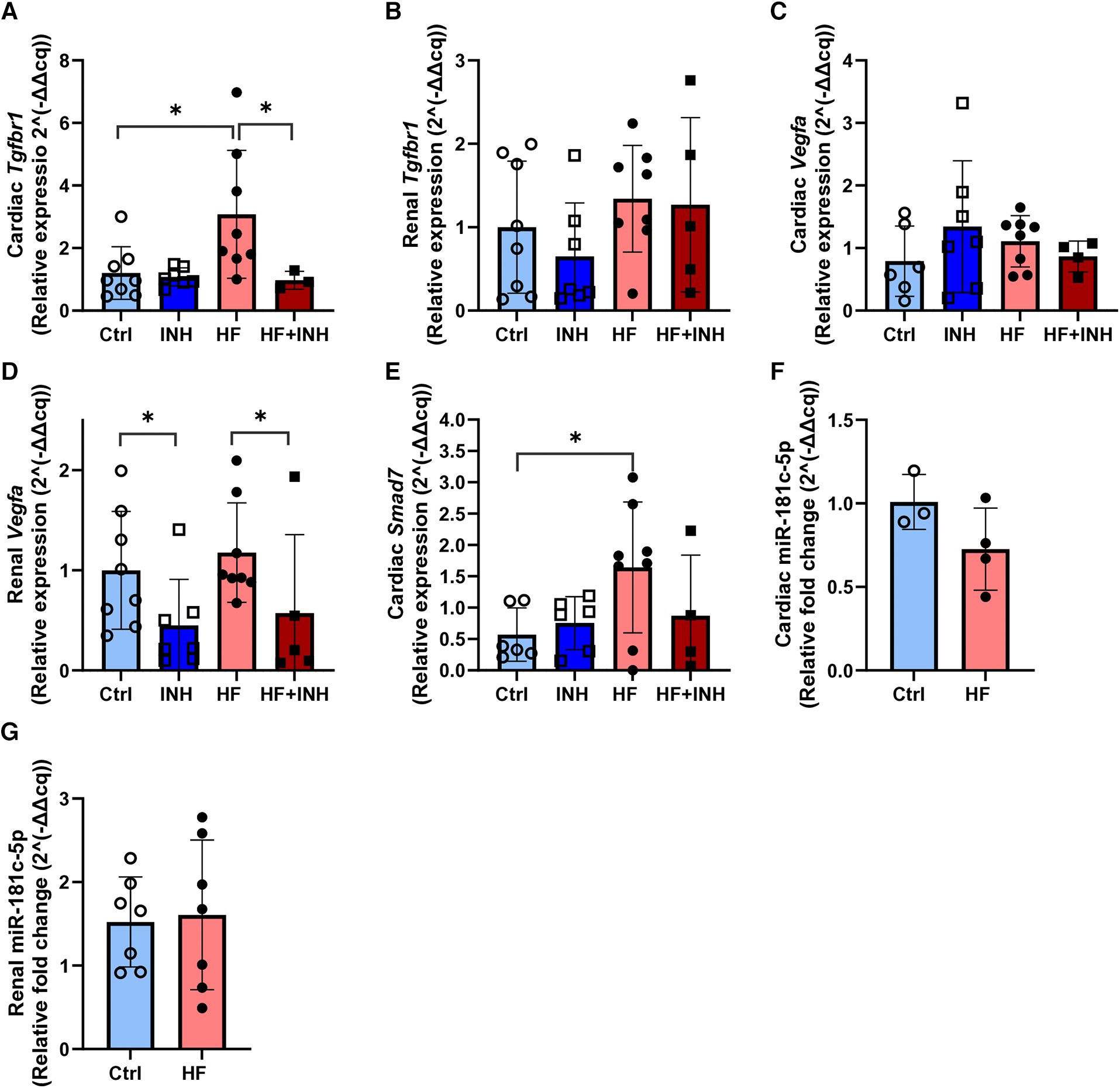 In contrast, Vegfa mRNA levels in renal tissue were halved in inhibitor-treated groups compared to scrambled groups, regardless of their phenotype (Ctrl 1 ± 0.59, INH 0.45 ± 0.46, p = 0.01; HF 1.18 ± 0.50, HF + INH 0.57 ± 0.78, p = 0.04). This demonstrates a miR-181c-5p-mediated regulation of Vegfa in kidney. Renal expression of Tgfbr1 was not influenced by treatment or phenotype.