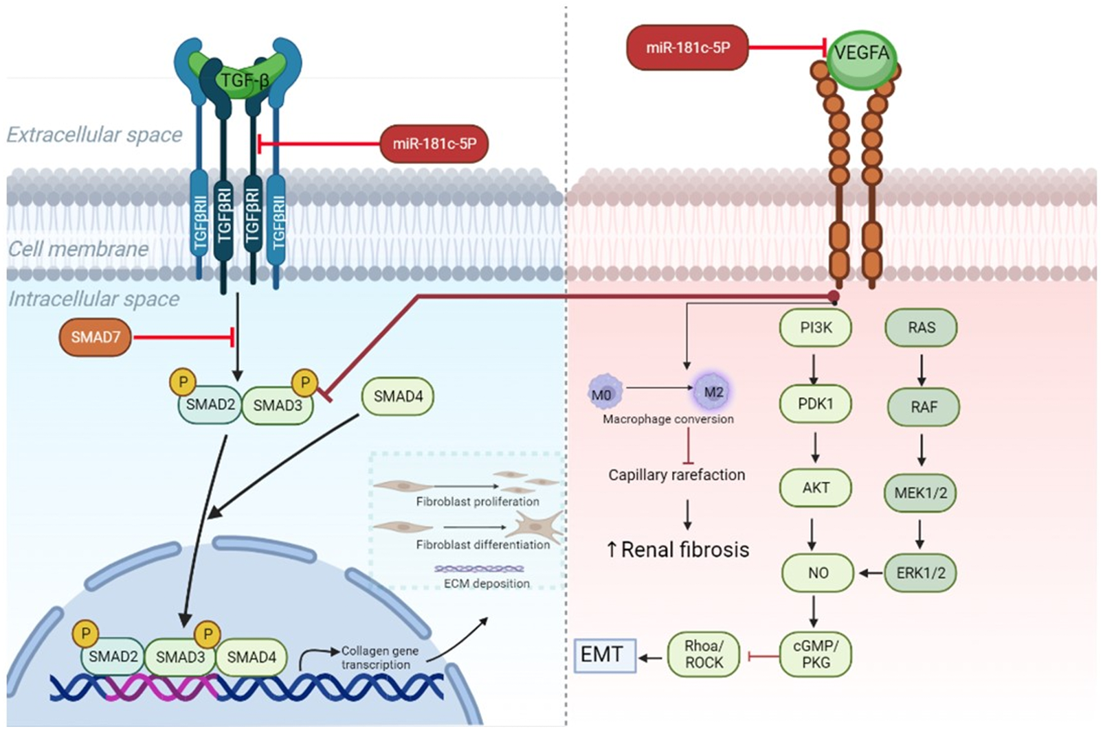 MiR-181c-5p-modulated pathways in heart and kidney. TGF-β downstream signaling induces activation of SMAD2/SMAD3 proteins and subsequent complex formation with SMAD4. By entering the nucleus, the protein complex can initiate transcription of genes involved in fibrosis, such as collagen, which after translation leads to extracellular matrix deposition, fibroblast proliferation, and differentiation from resting fibroblasts into myofibroblasts. All these processes drive fibrogenesis. In cardiac tissue miR-181c-5p inhibition reduces the levels of Tgfbr1— which is a type 1 receptor of TGF-β—and cooperates in this way to block myocardial fibrosis. Recent research demonstrates anti-fibrotic effects of Vegfa signaling in kidney (55). This can occur via direct targeting of TGF-β signaling by blocking SMAD3, while endothelial mesenchymal transition (EMT) is hampered through PI3K/AKT and ERK1/2 signaling activation. Furthermore, preventing capillary rarefaction by its proangiogenic properties, like conversion of resting M0 in activated M2 macrophages, hinders renal fibrosis. Inhibition of miR-181c-5p in renal tissue results in lowered expression levels of Vegfa, which reduces downstream signaling and could promote increased fibrotic activity. ECM, extracellular matrix; EMT, endothelial mesenchymal transition; Tgf-β, transforming growth factor β; Vegfa, vascular endothelial growth factor A; TgfbrI, transforming growth factor β receptor I.