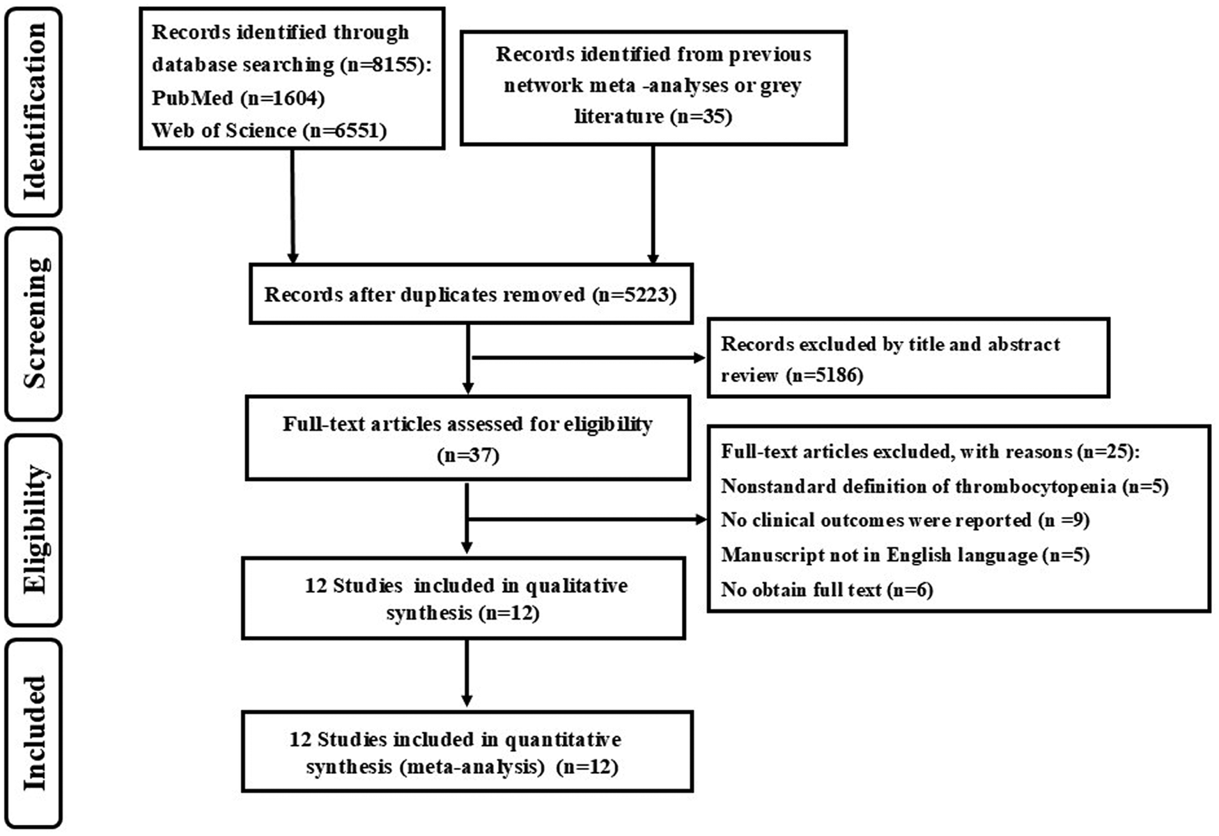 The searching strategy had identified 5,223 studies (Figure 1). Of these, 37 potentially relevant studies were identified for full text assessment. After excluding 25 studies, all the rest 12 studies met the inclusion criteria. In the report OR research, 10 studies examined the association between thrombocytopenia and ischemic stroke/systemic embolism, 9 studies examined the association between thrombocytopenia and major bleeding, and 7 studies examined the association between thrombocytopenia and all-cause mortality.