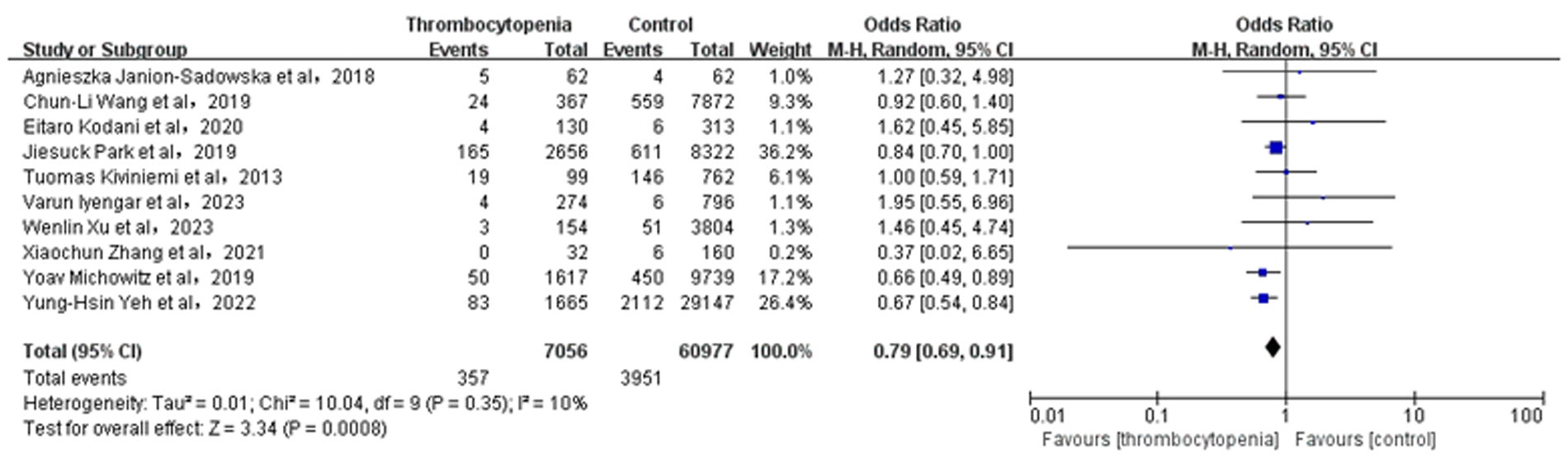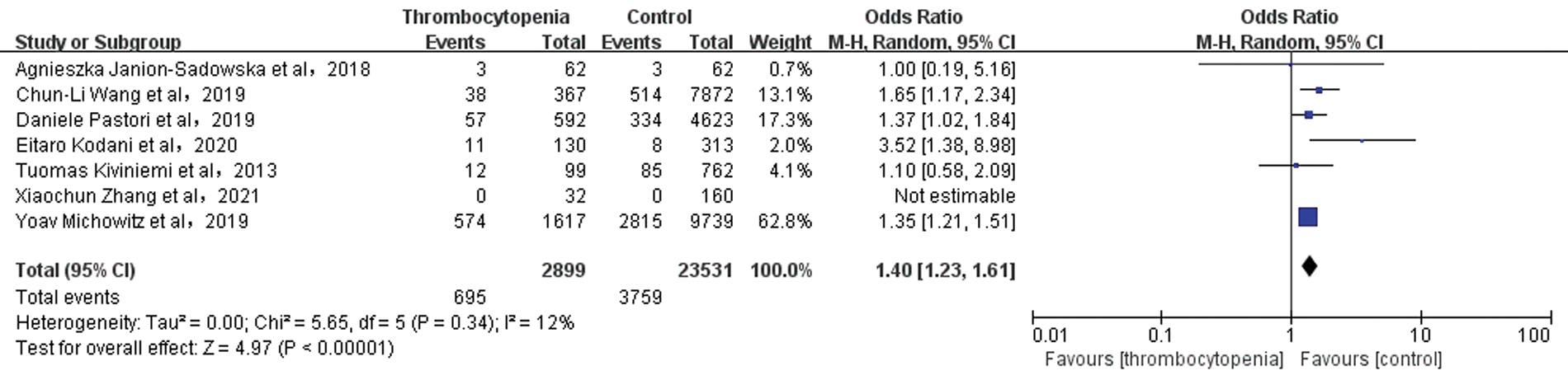 A total of 12 studies included 73,824 patients with atrial fibrillation (average age: 72.67, males: 42,275, 57.3%), among them, there were 7,673 patients combined with thrombocytopenia. The average follow-up time of these studies was 87 days to 55 months. Compared to no thrombocytopenia, atrial fibrillation patients combined with thrombocytopenia have a significant risk reduction of ischemic stroke/systemic embolism [OR: 0.79, 95% CI: (0.69, 0.91); P < 0.01]. Nevertheless, the risk of both major bleeding [OR: 1.51, 95% CI: (1.20, 1.79), P < 0.01] and all-cause mortality [OR: 1.40, 95% CI: (1.23, 1.61); P < 0.01] is significantly higher in thrombocytopenia group.