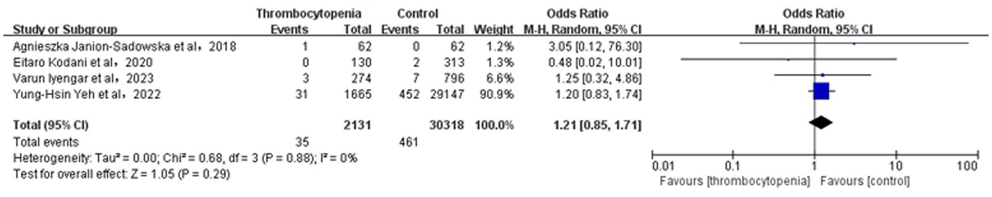 A total of 4 studies with 32,449 participants involved examined the association between thrombocytopenia and intracranial hemorrhage (Figure 7). Overall, the risk of intracranial hemorrhage in AF combined with thrombocytopenia was similar to that in AF [OR: 1.21, 95% CI: (0.85, 1.71), P = 0.29], with no heterogeneity [(I2) = 0%]. The Egger's test showed no evidence of publication bias (Supplementary Table S2, P = 0.9933).