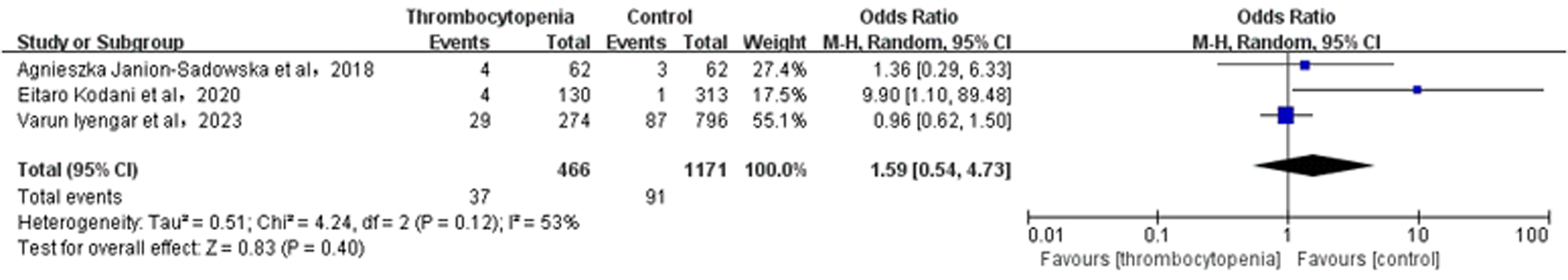 A total of 3 studies with 1637 participants involved examined the association between thrombocytopenia and clinically relevant non-major bleeding (Figure 8). Overall, the clinically relevant risk of non-major bleeding in AF combined with thrombocytopenia was similar to that in AF [OR: 1.59, 95% CI: (0.54, 4.73), P = 0.40]. Heterogeneity was relatively high [(I2) = 53%]. Due to the high heterogeneity, we also conducted a sensitivity analysis by excluding the study [Eitaro Kodani et al. (29)] and found that thrombocytopenia was associated with a nonsignificant increased risk of clinically relevant non-major bleeding [OR: 0.99; 95% CI: (0.65, 1.52)] compared with control group (Supplementary Figure S6). The Egger's test displayed no evidence of publication bias (Supplementary Table S2, P = 0.0997).