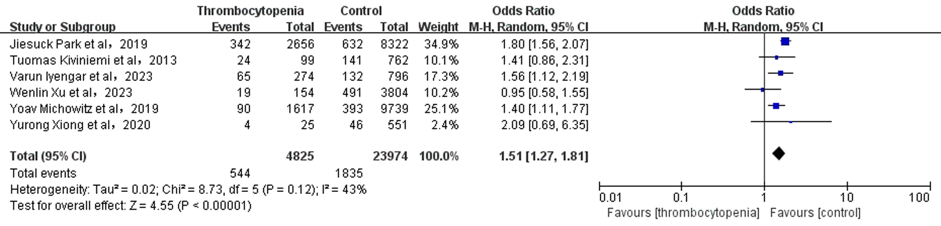 Two electronic databases, PubMed and Web of Science, were systematically searched from their inception to December 1, 2023, including the studies on the correlation between atrial fibrillation patients with thrombocytopenia and adverse outcomes. Relevant data was extracted, literature quality was evaluated, meta-analysis was performed by using REVMAN 5.4 software, and the results were reported with odds ratio (OR) of 95% confidence interval (CI).