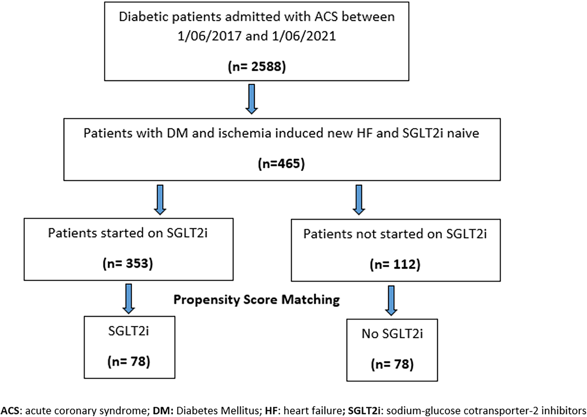 This retrospective cohort study was conducted at the Heart Hospital in Doha, Qatar, which is the main tertiary cardiology center within Hamad Medical Corporation (HMC), the country's principal public healthcare provider. The study was approved by the Medical Research Centre and Institutional Review Board at HMC (approval number: MRC-01-22-529). In the study, we included all patients with type 2 DM who were admitted to the Heart Hospital over 4 years between 1 June 2017 and 1 June 2021, with ACS complicated by new AHF defined as newly diagnosed HF with EF < 40% or clinical HF requiring diuretic therapy during the index admission regardless of the EF. Using a whole-population sampling approach, all patients with ischemia-induced new HF who met the eligibility criteria were included. The study population was then divided into two groups: (1) SGLT2 inhibitor users and (2) SGLT2 inhibitor non-users.